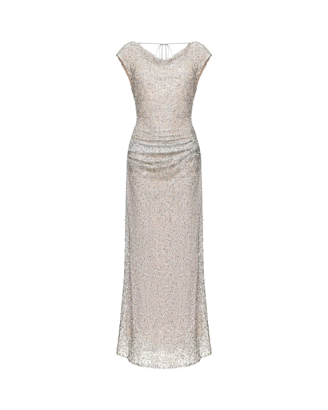 Dakota maxi, maxi dress made of ivory organza with a medium floral print and a rose