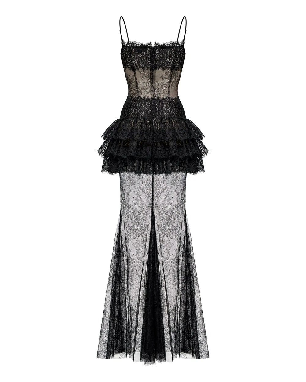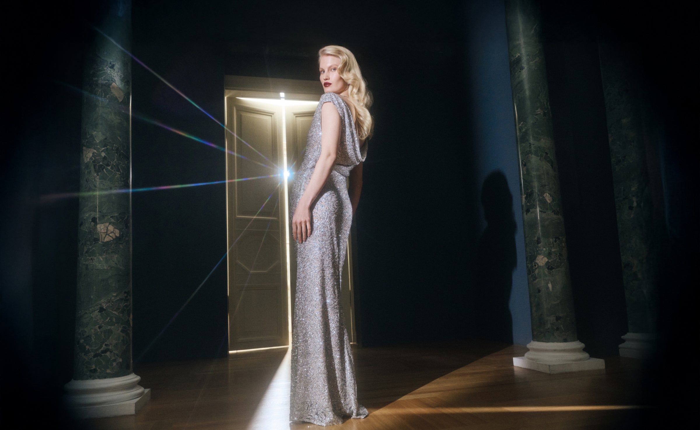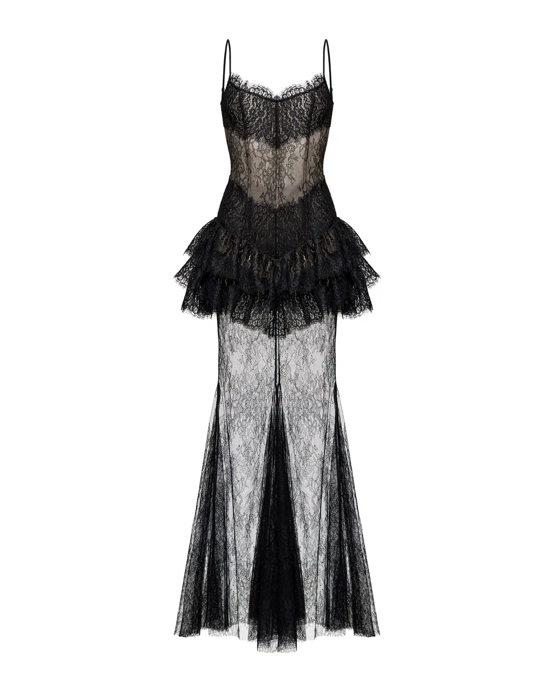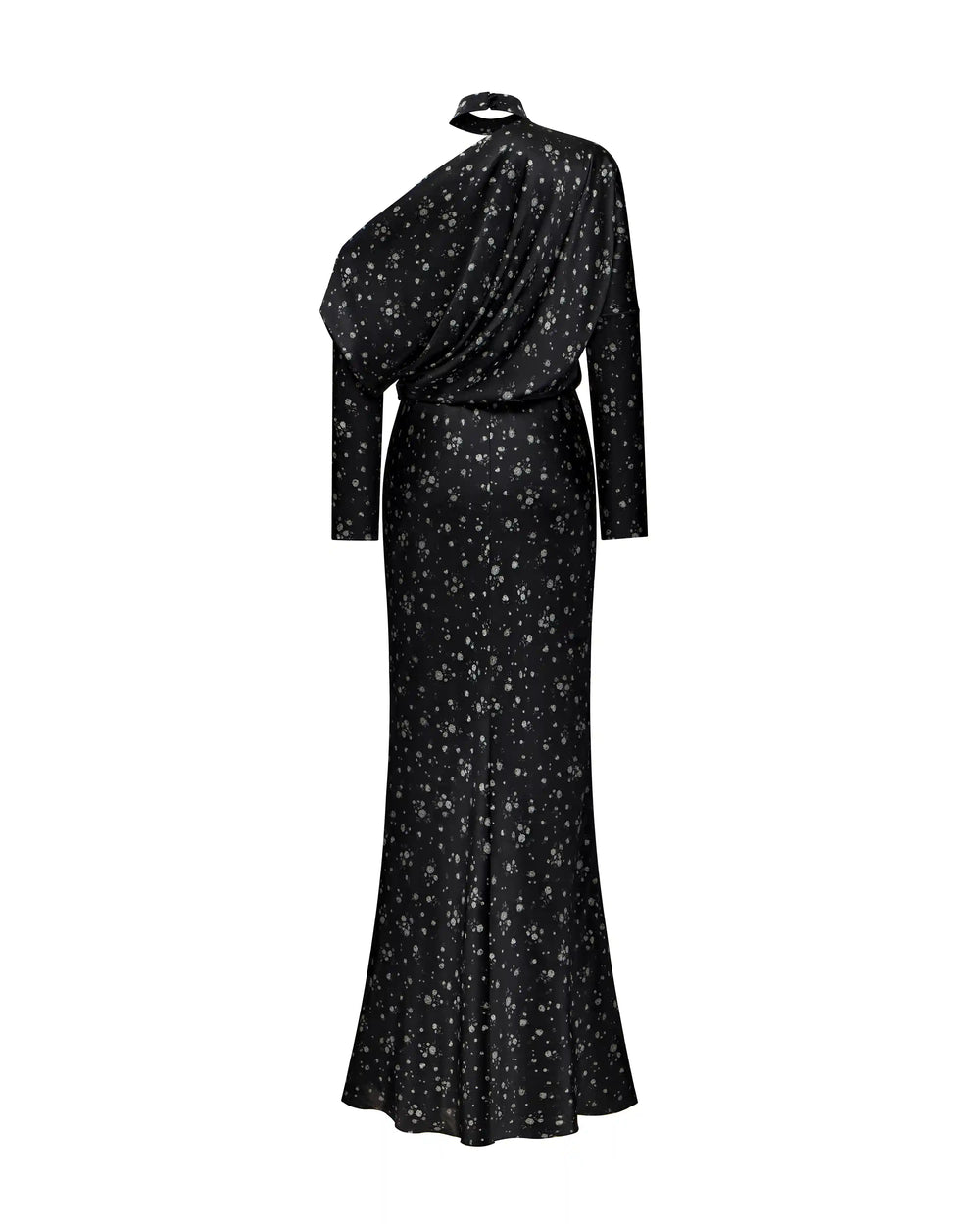 Anika maxi, maxi dress with long sleeves and a choker made of black satin with floral print