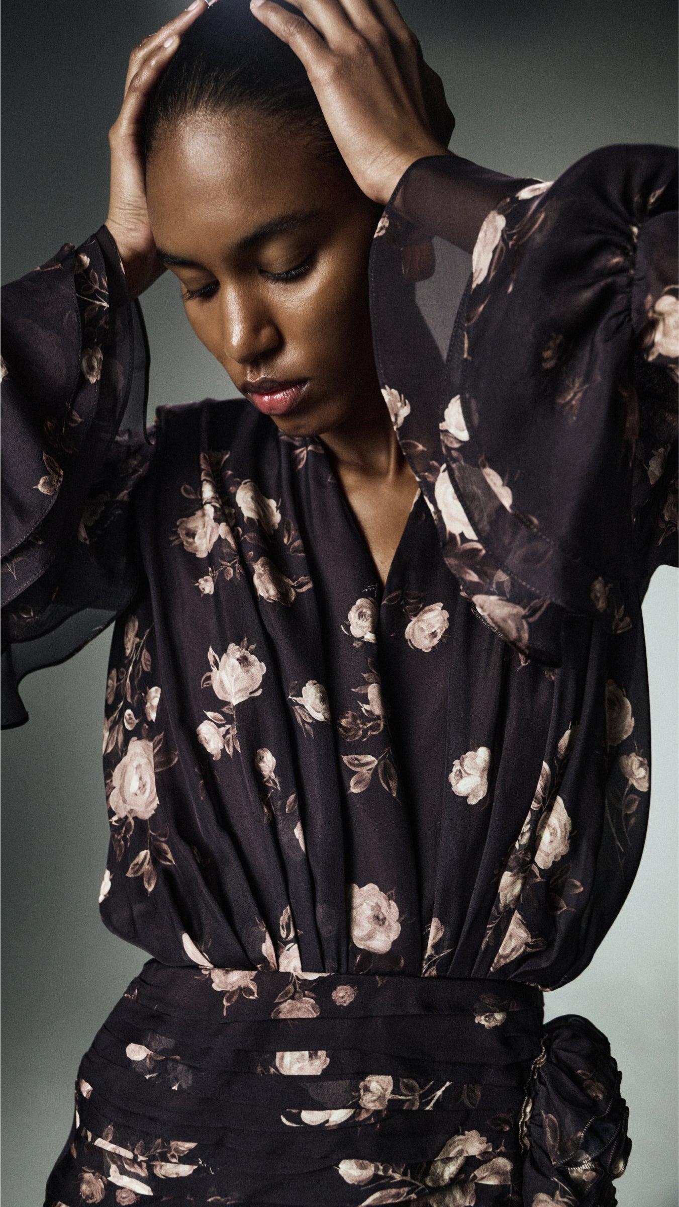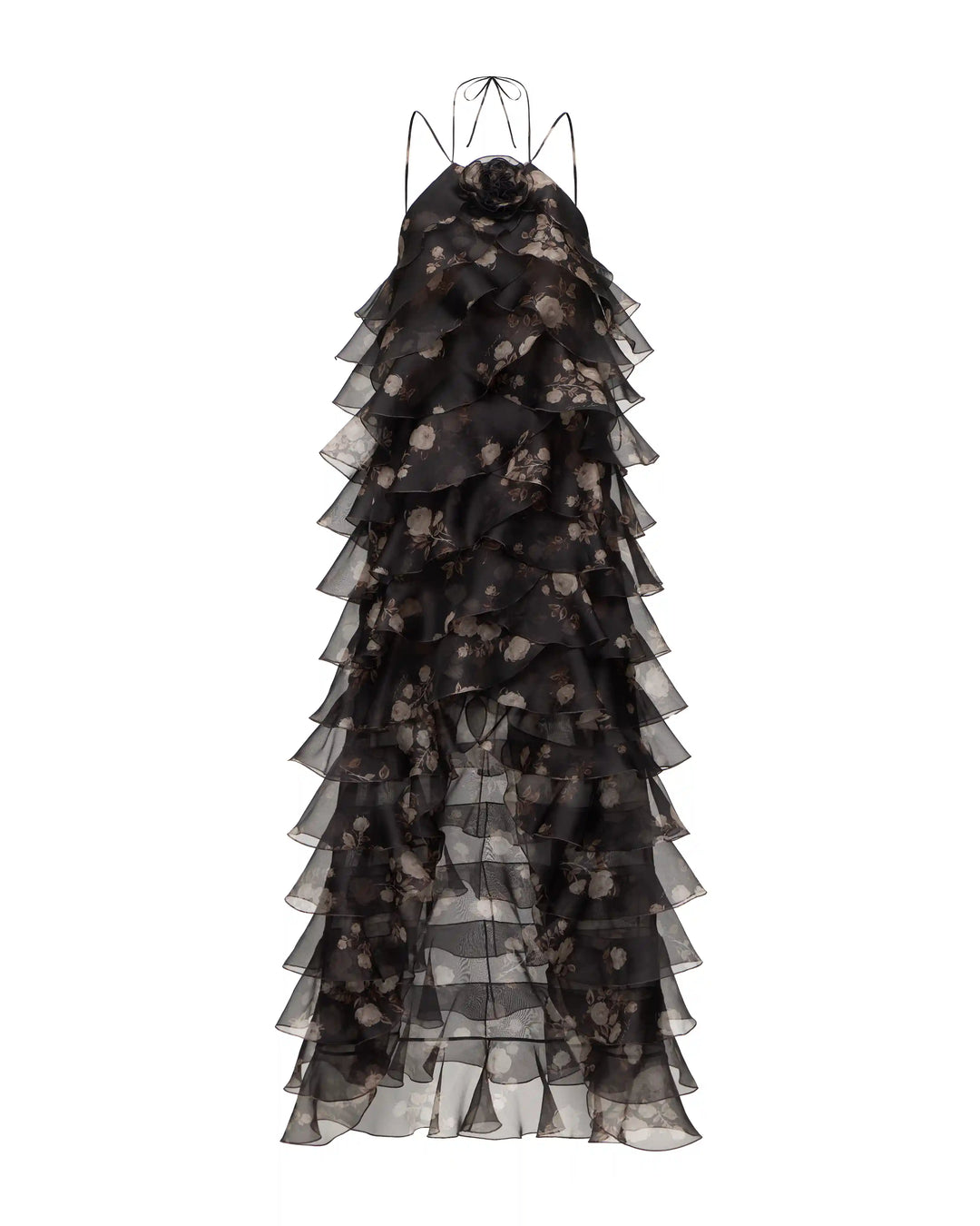 Dakota, maxi dress made of chocolate organza with floral print