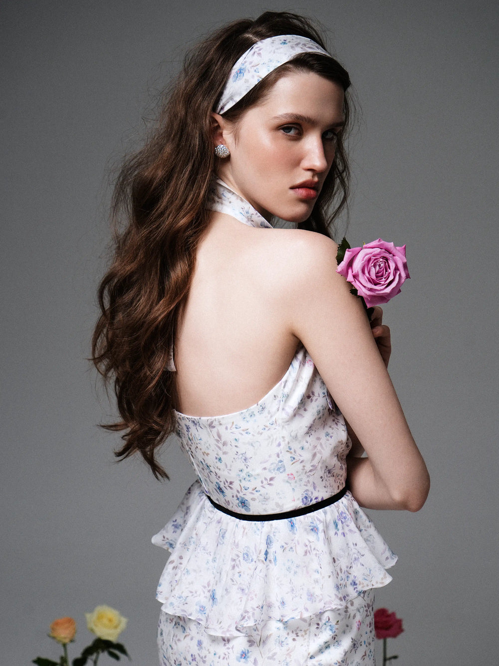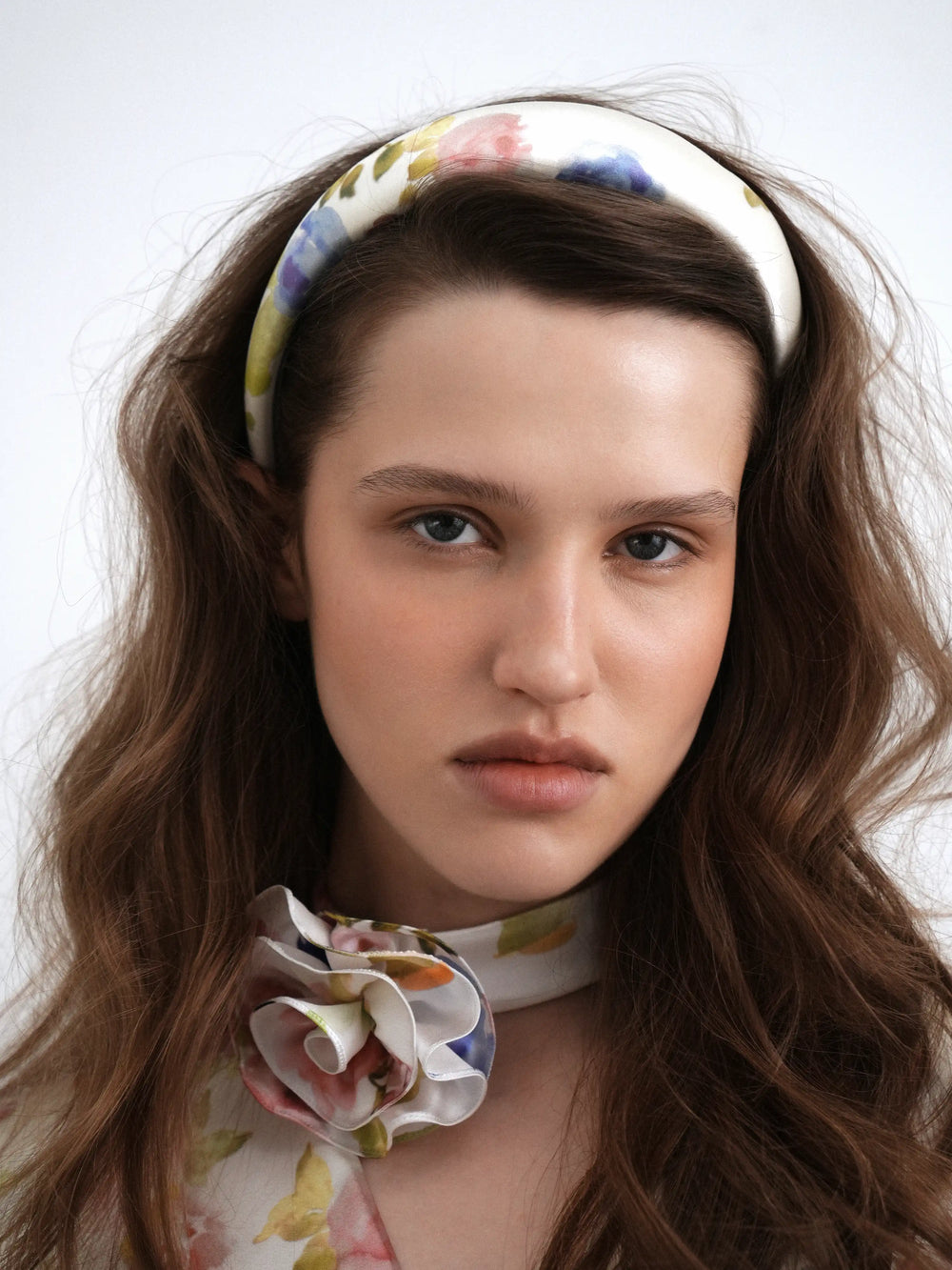 Noelia, wide milky satin headband with a floral print