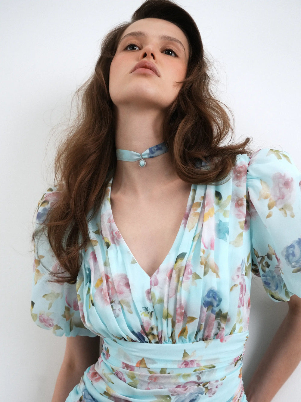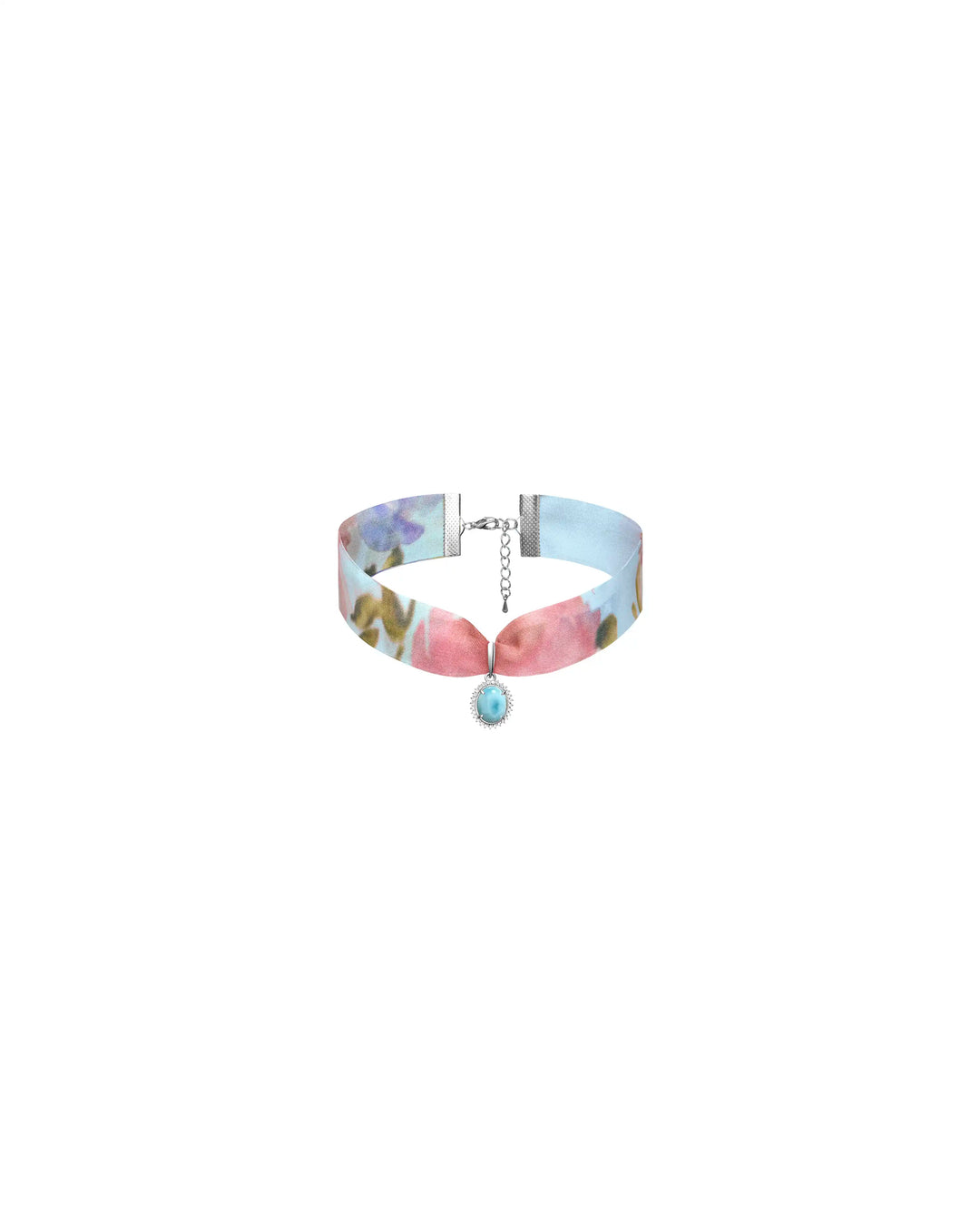 Arin, blue chiffon choker with a floral print and pendant detail