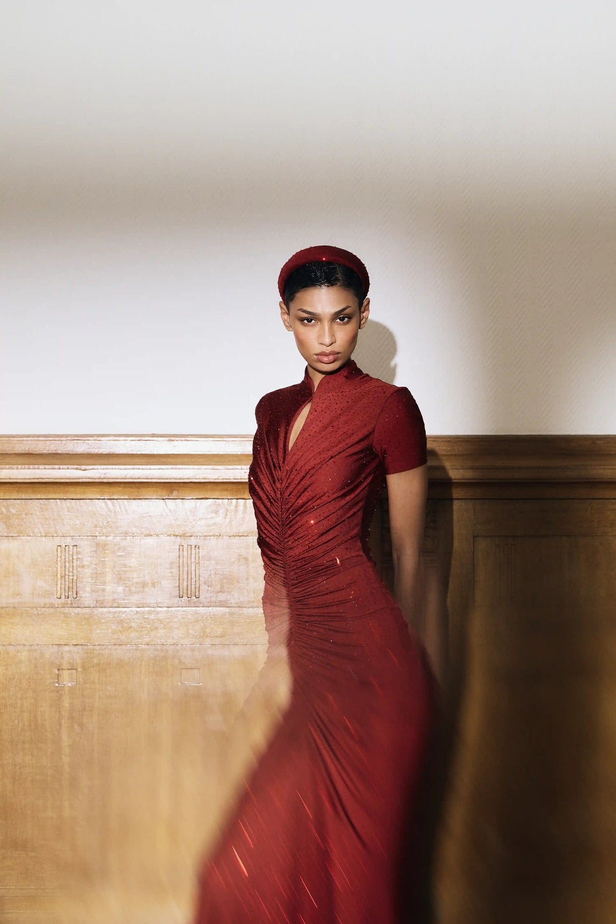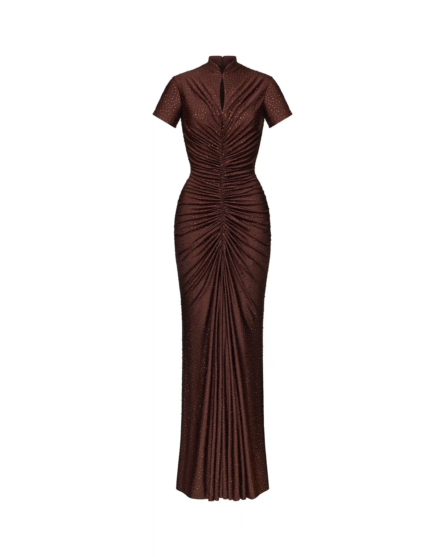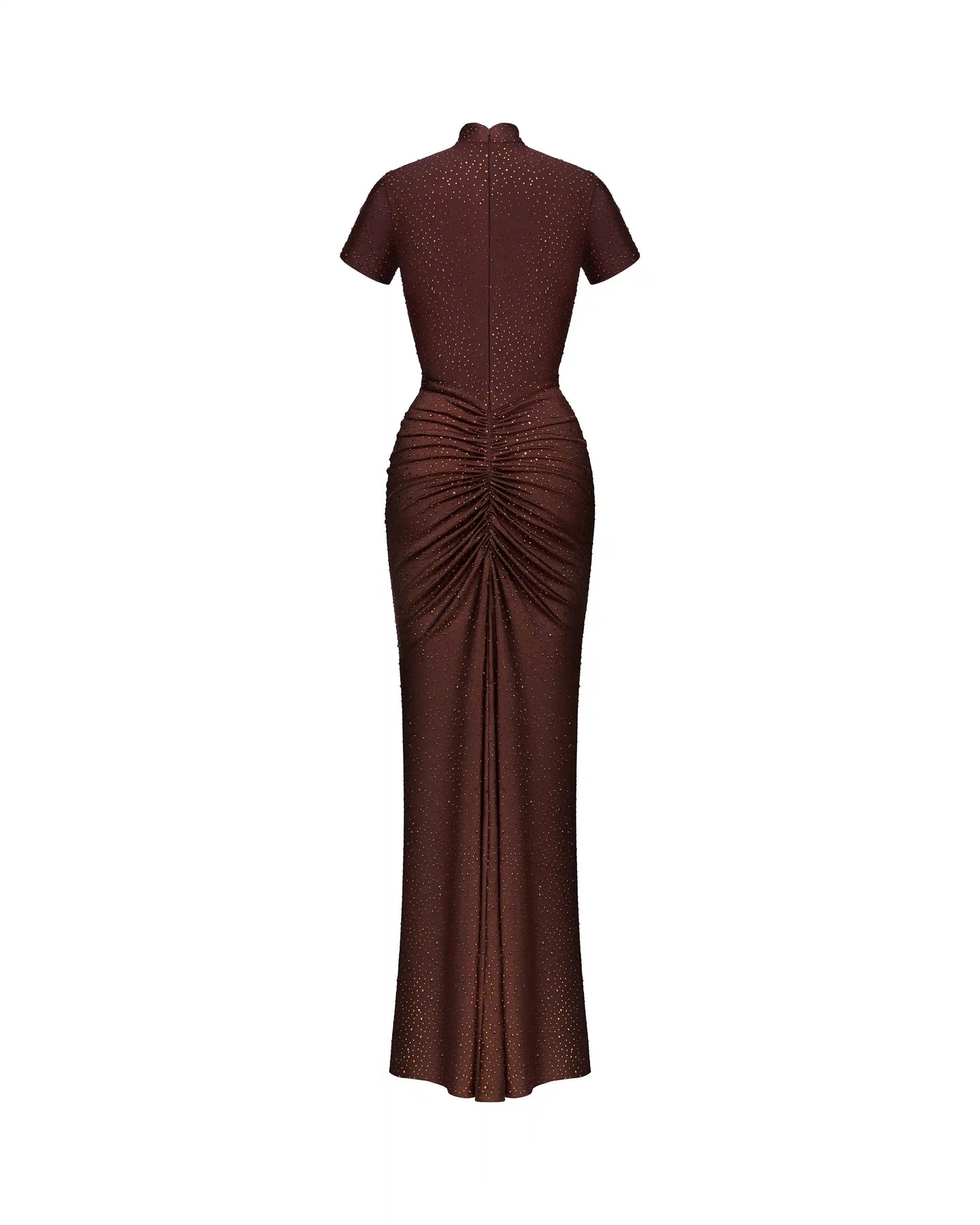 Draped chocolate biflex maxi dress with short sleeves and rhinestones