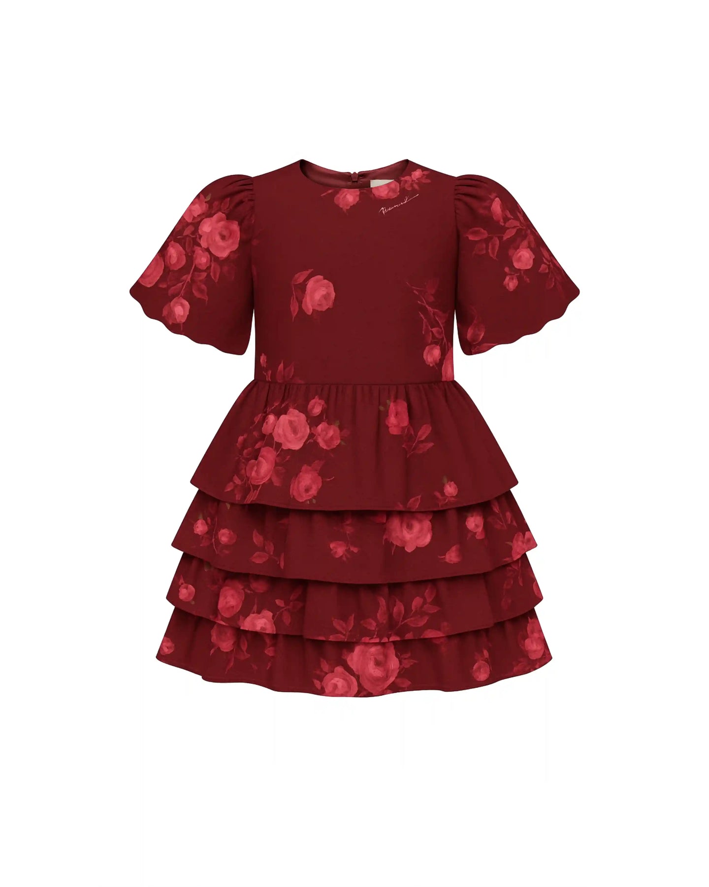 Fifi, children’s dress made of burgundy crepe de chine with a floral print