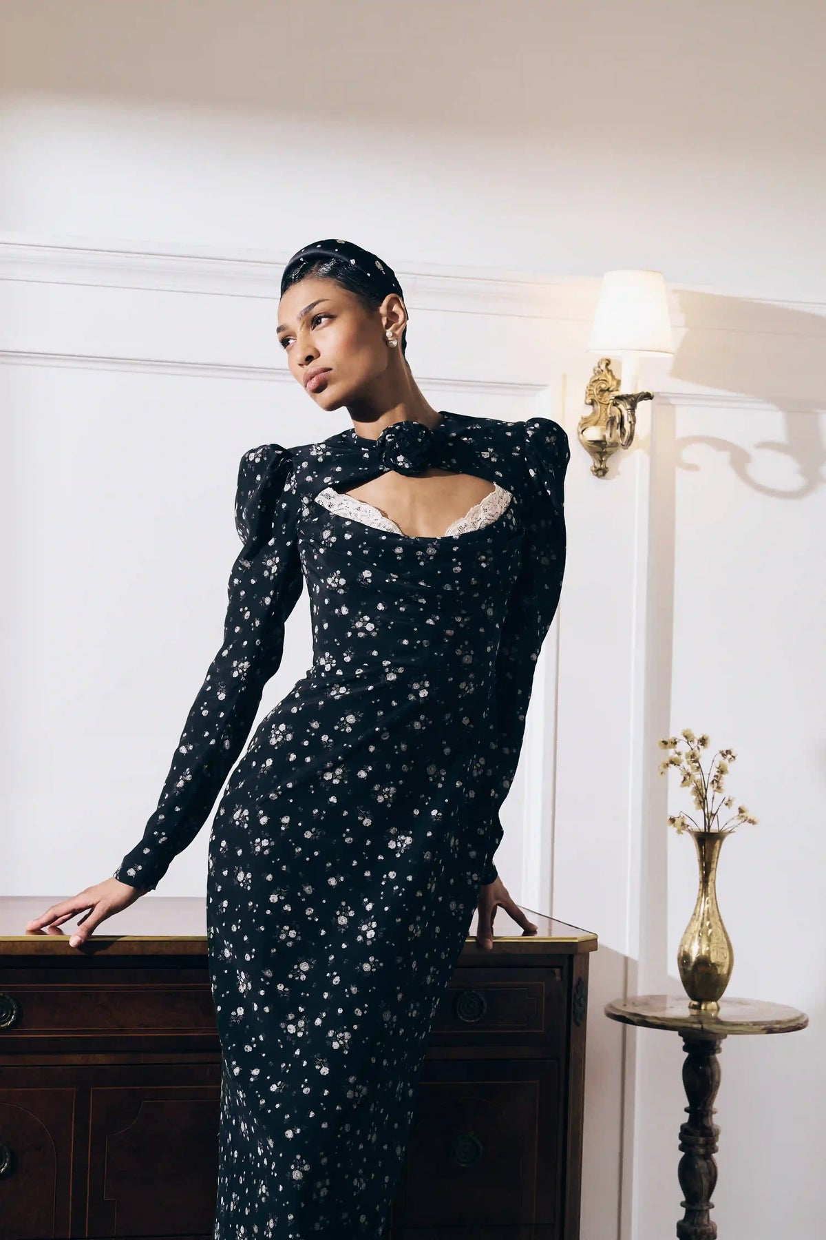 Macel midi, midi dress made of dark green crepe de chine with a floral print