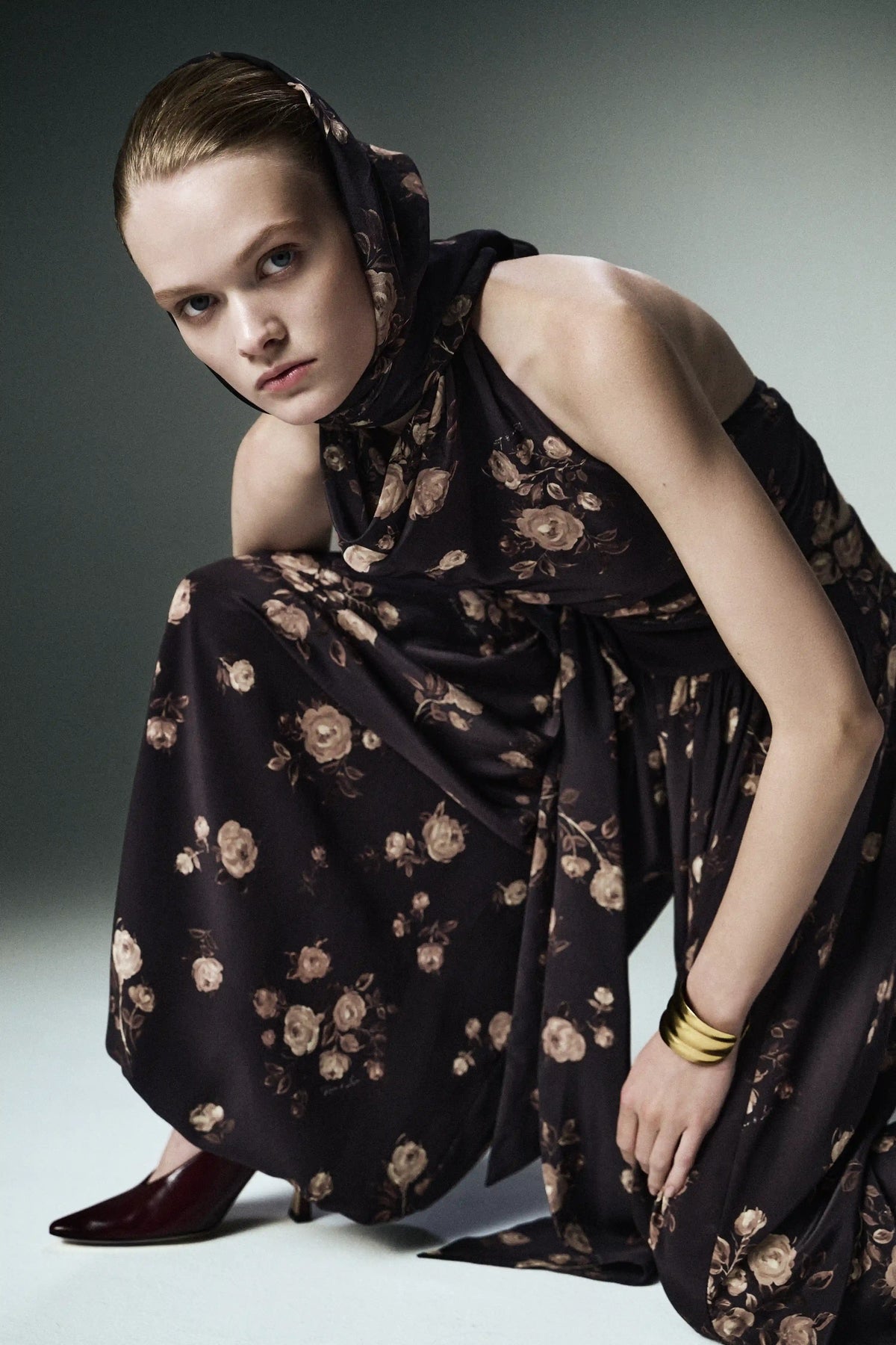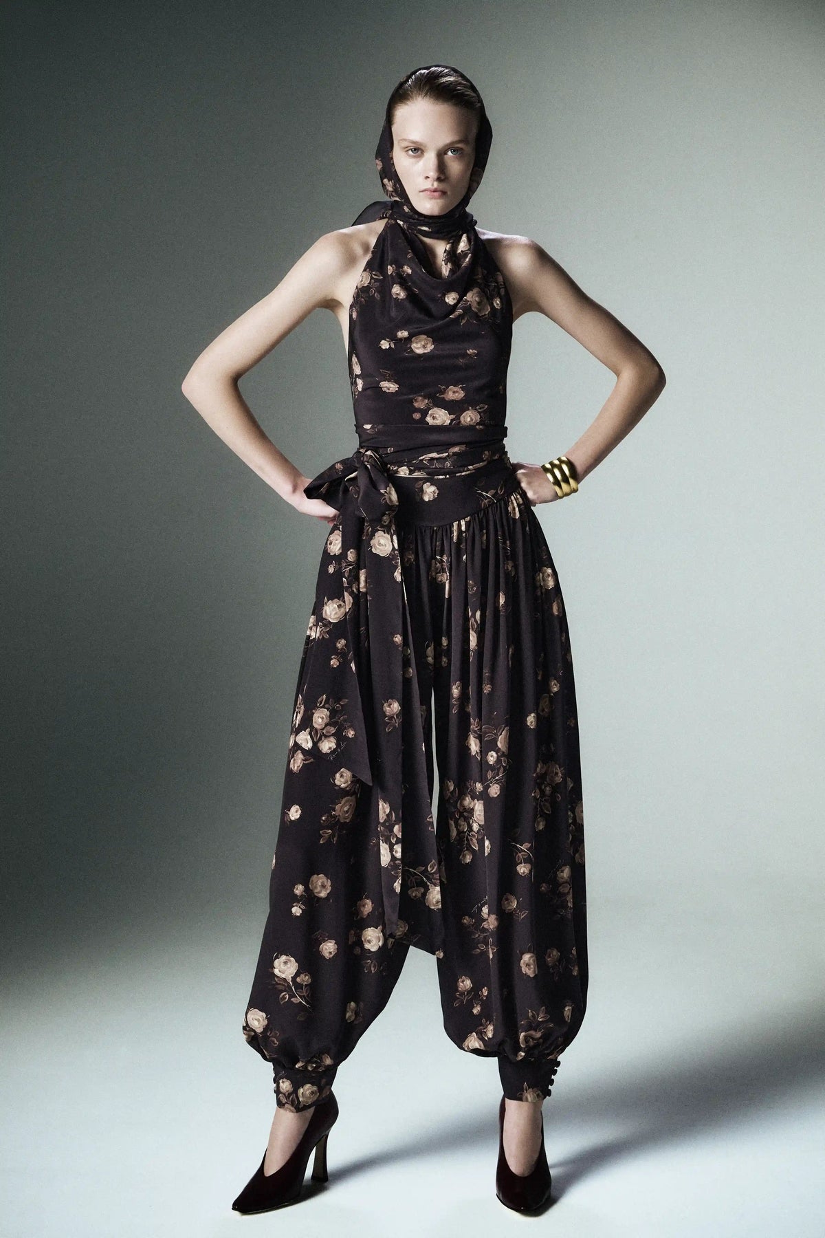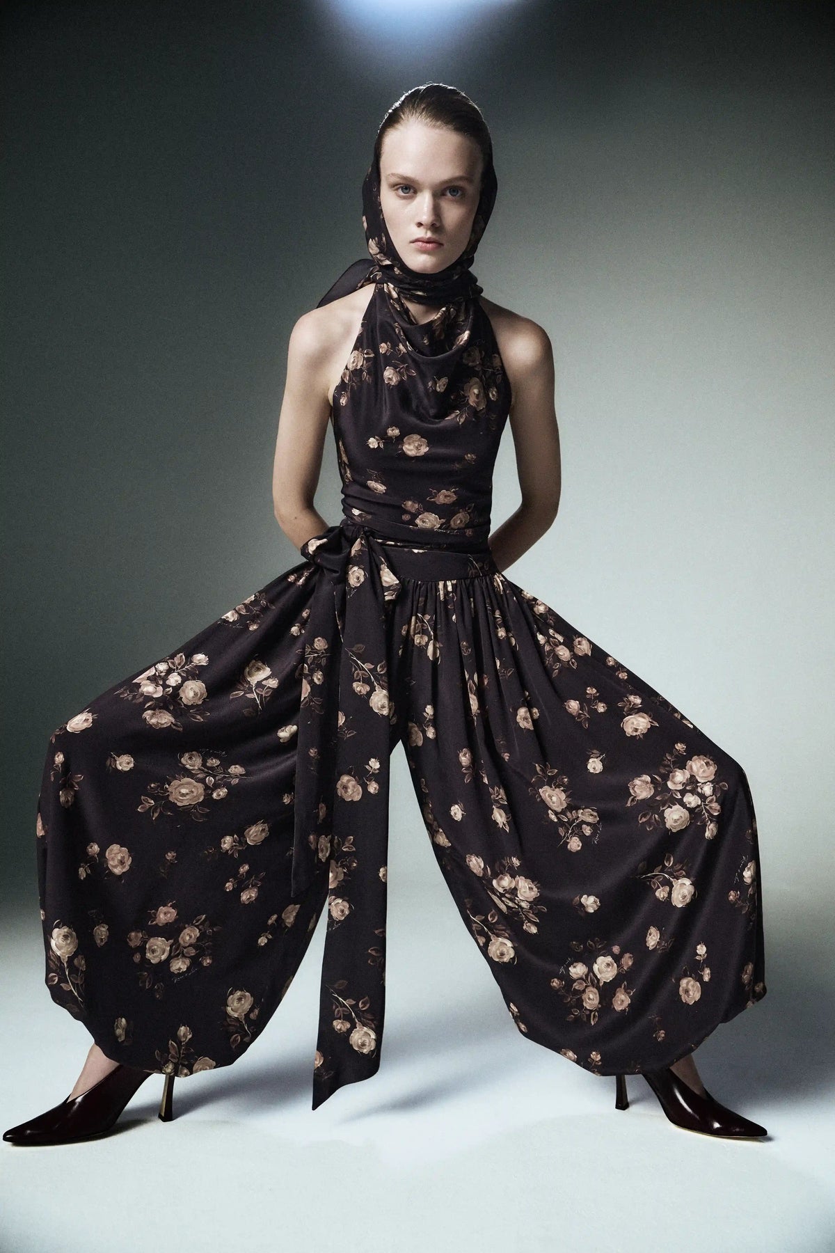 trousers with ruffles made of chocolate crepe de chine with floral print