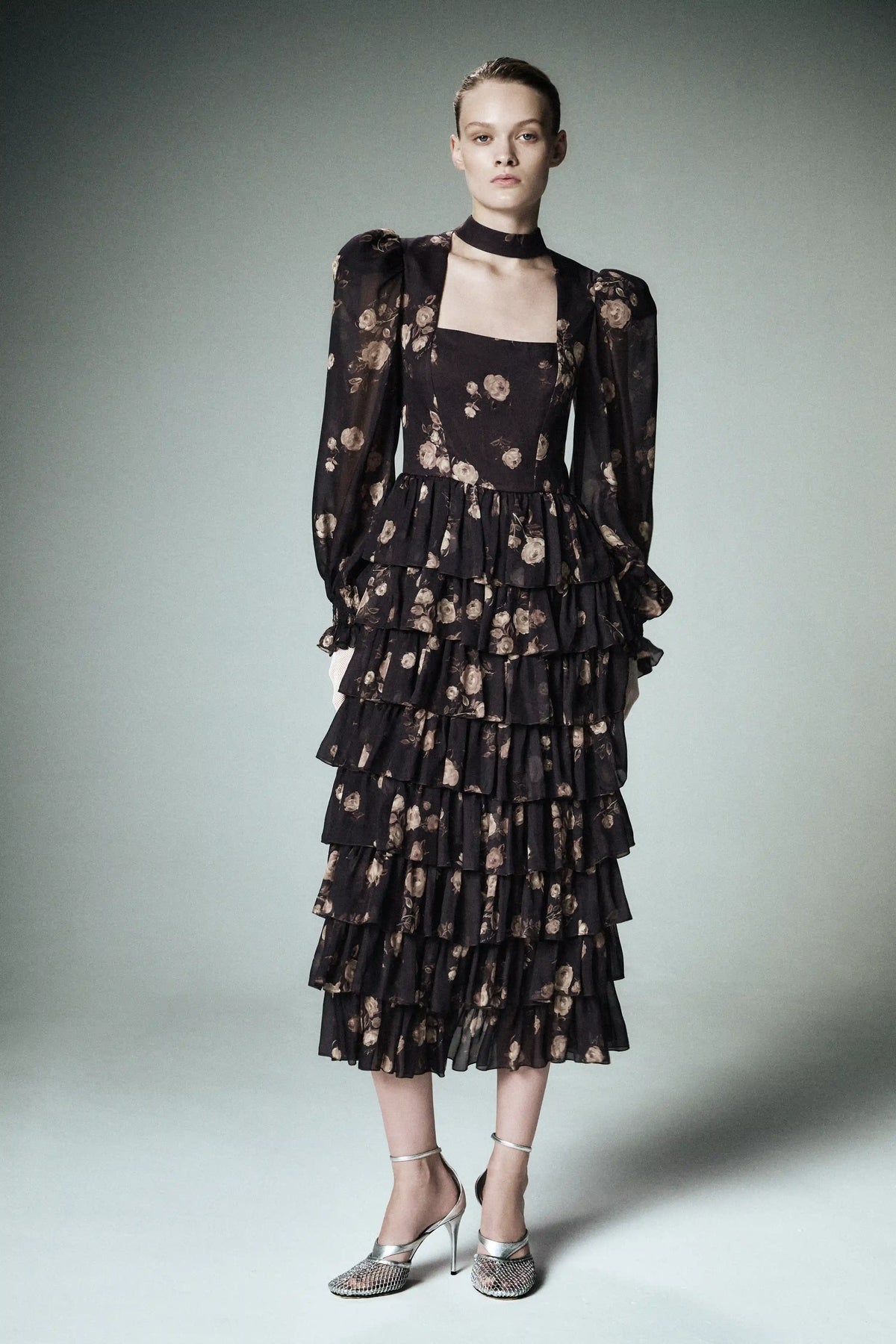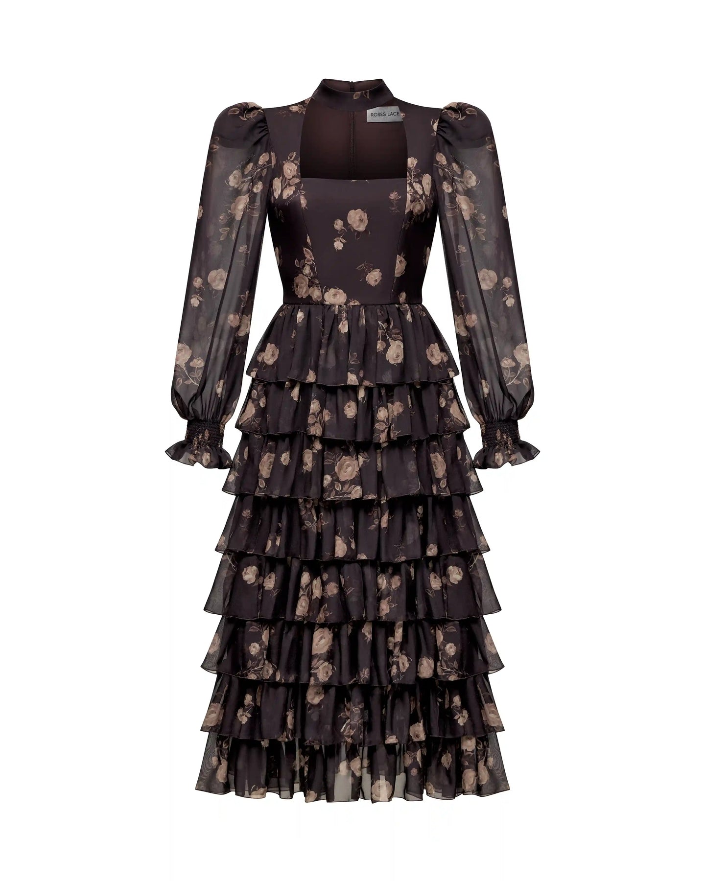 Valerie midi, midi dress made of chocolate chiffon with floral print