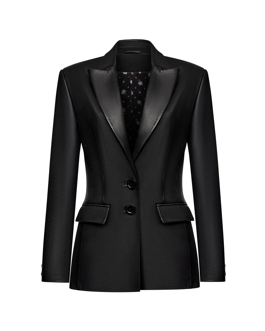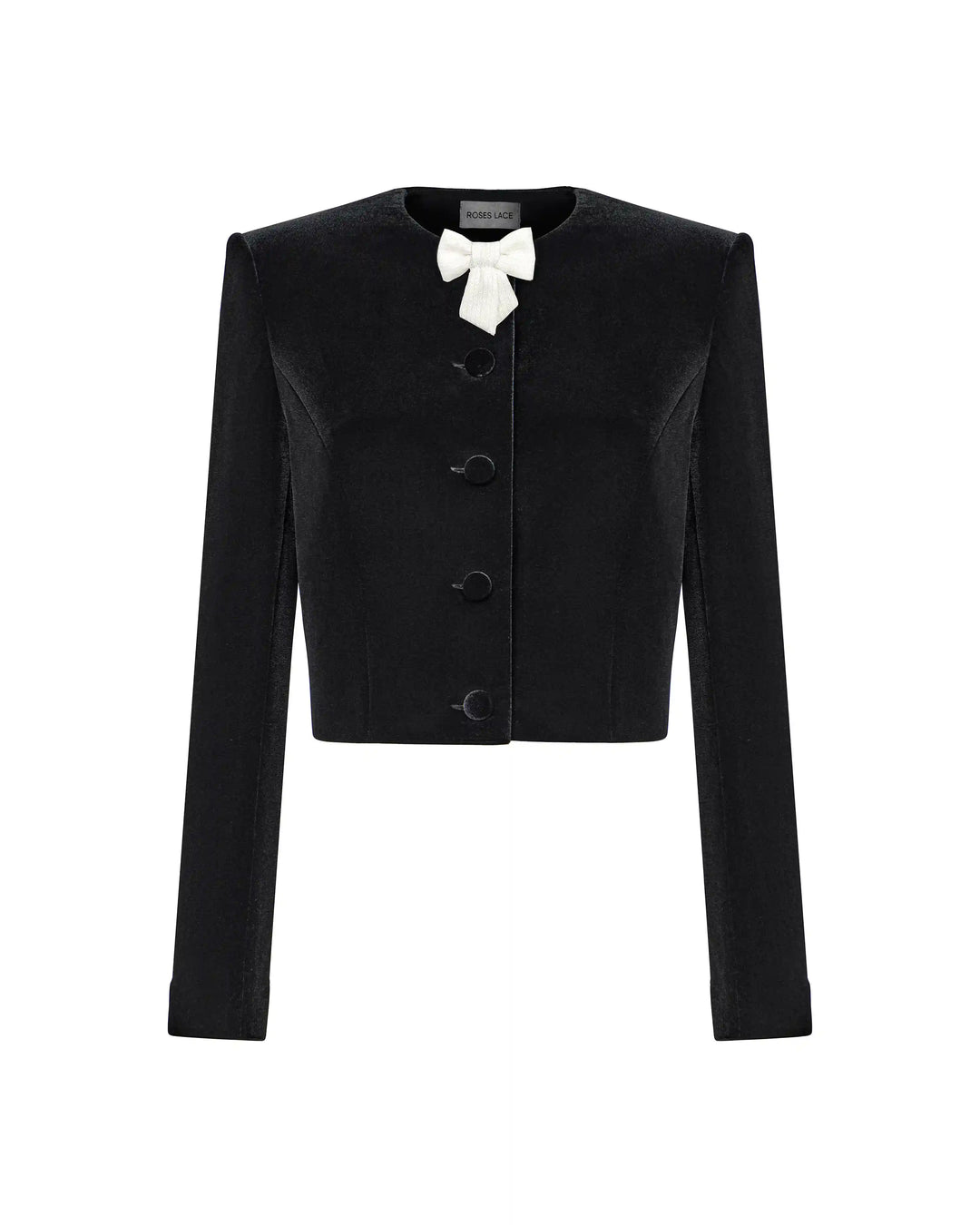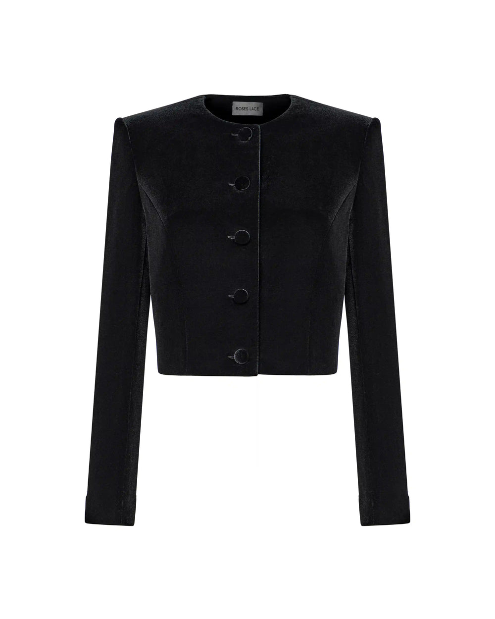 Chanelle, cropped jacket with puff sleeves, black with medium pink flowers