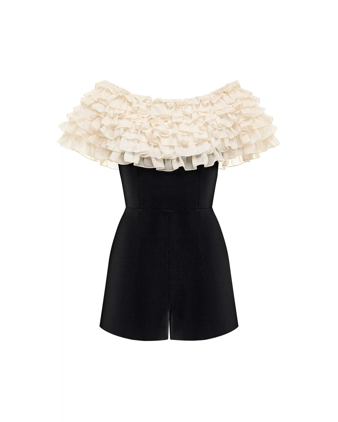 Nika mini, mini dress with a black sequin bodice and a balloon skirt in ivory taffeta