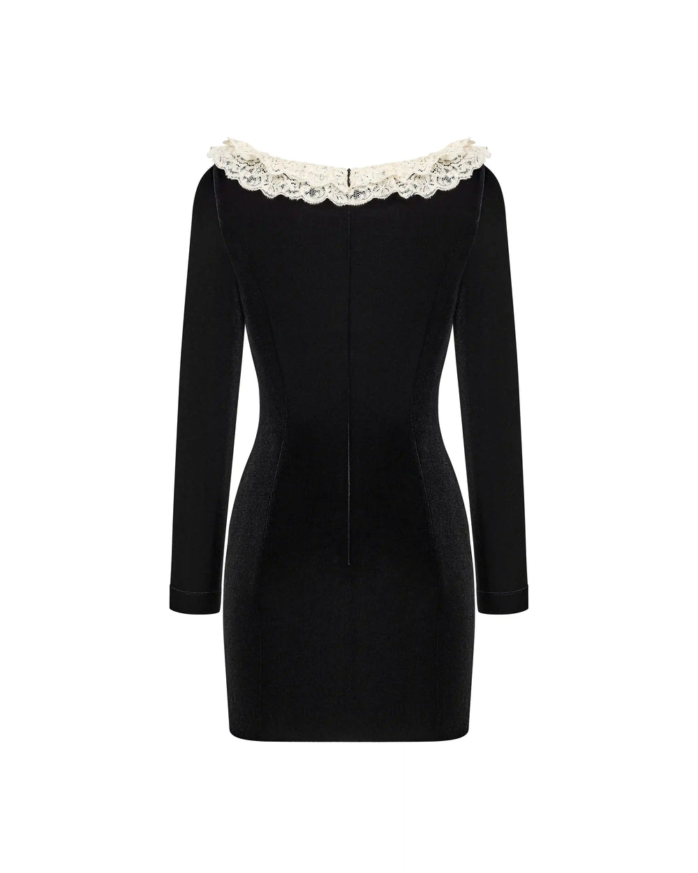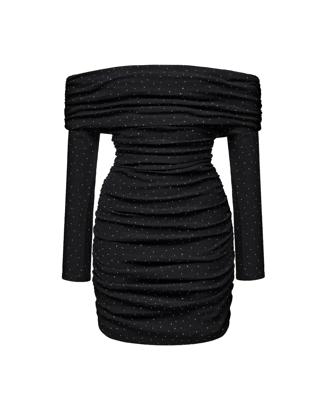 Iry mini, draped mini dress with long sleeves made of black biflex with rhinestones