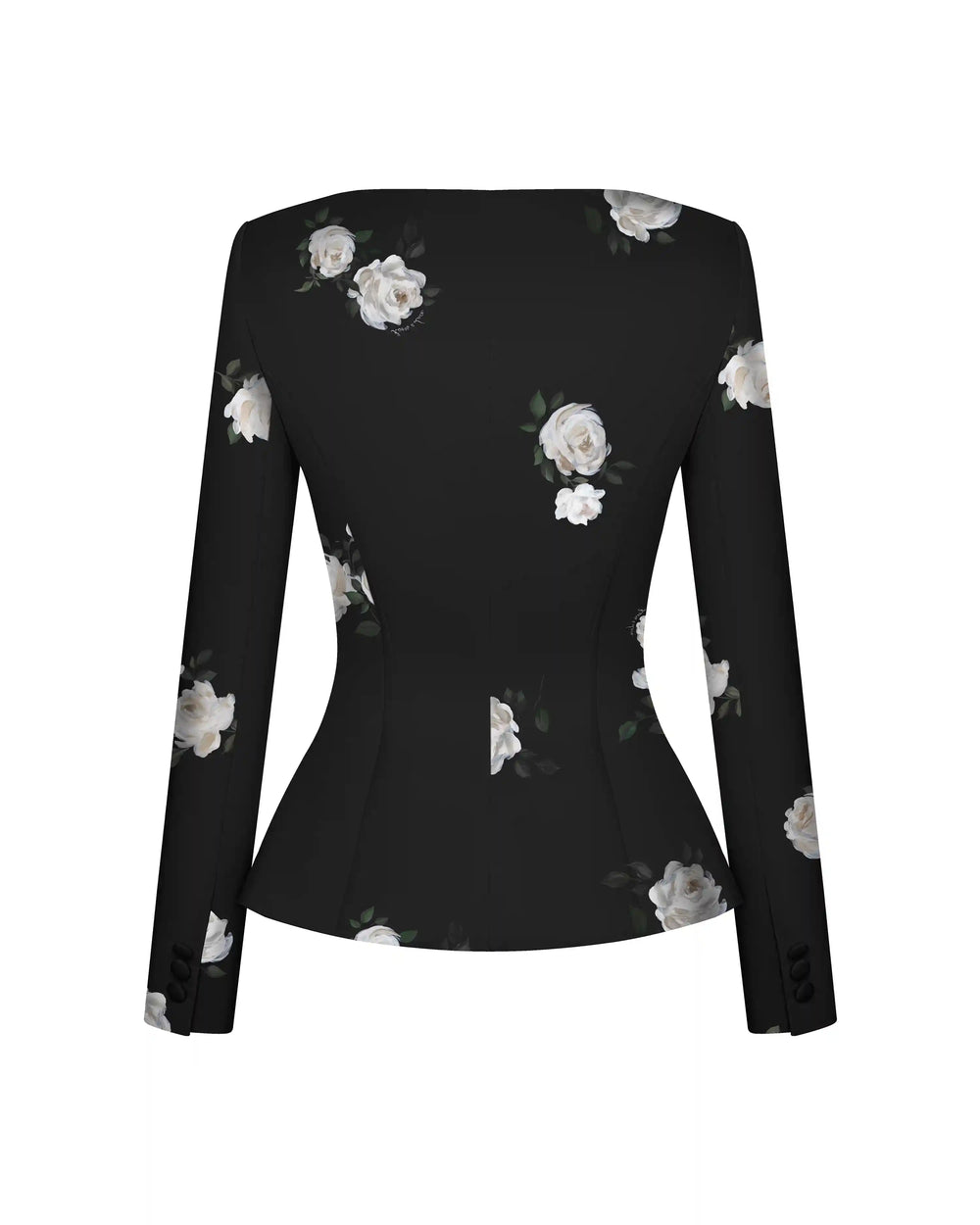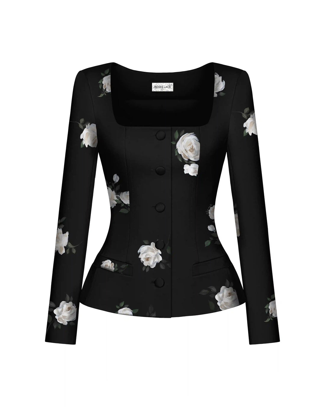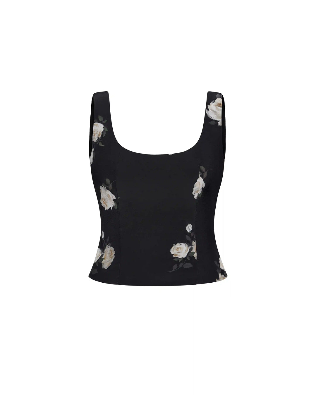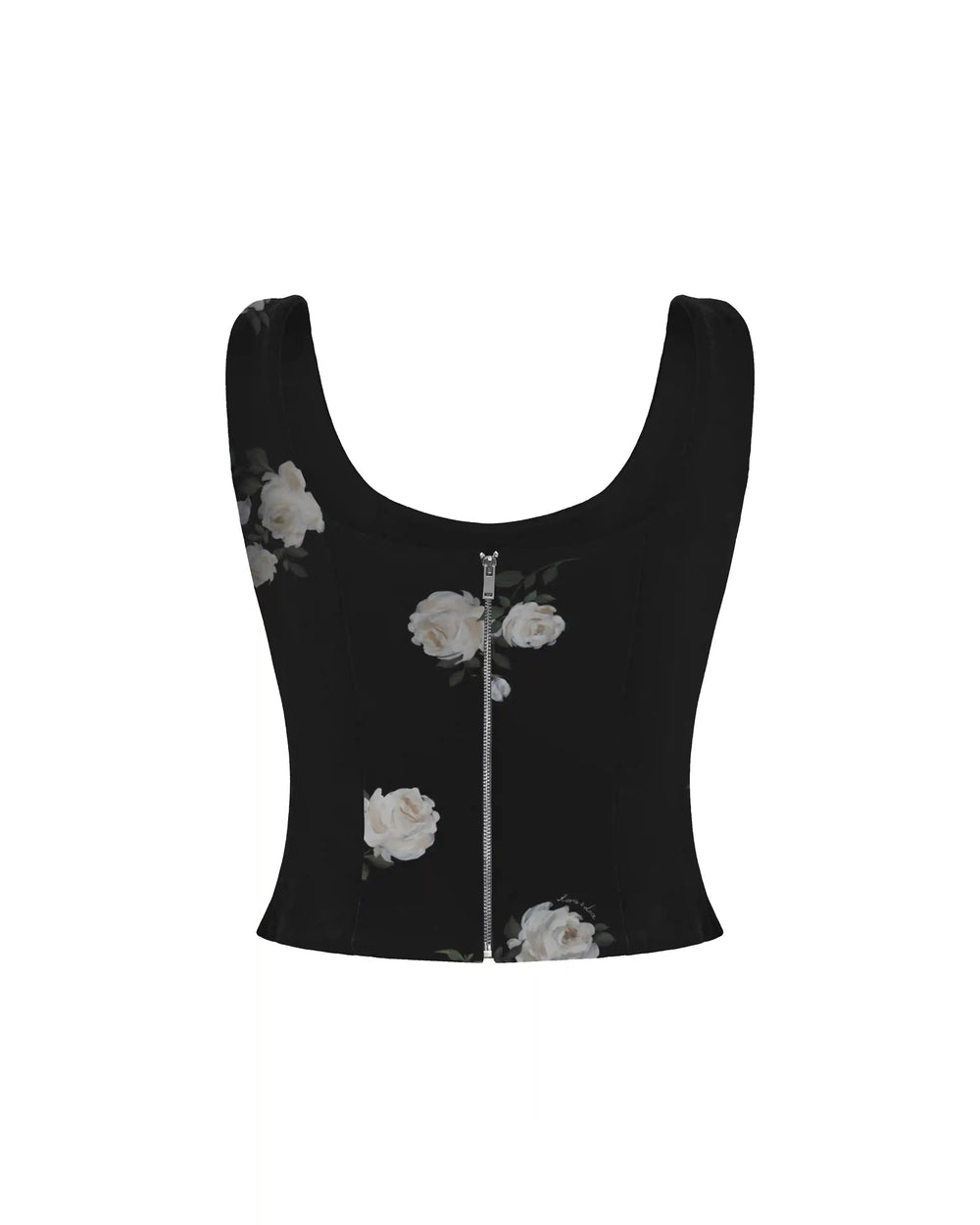 Lee top, corset top with straps made of black crepe de chine with floral print