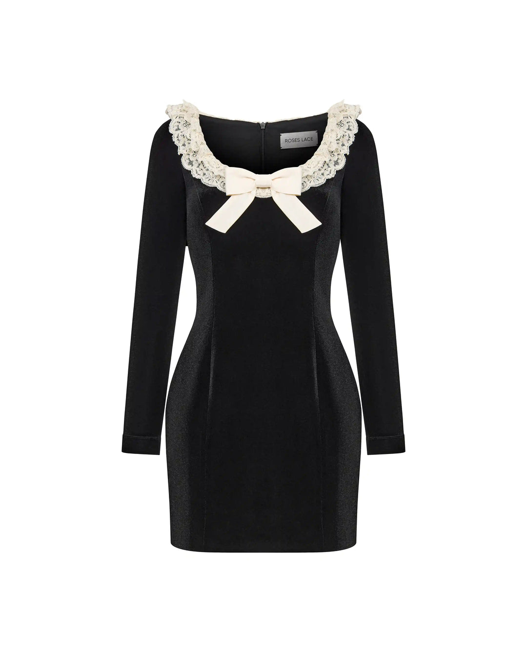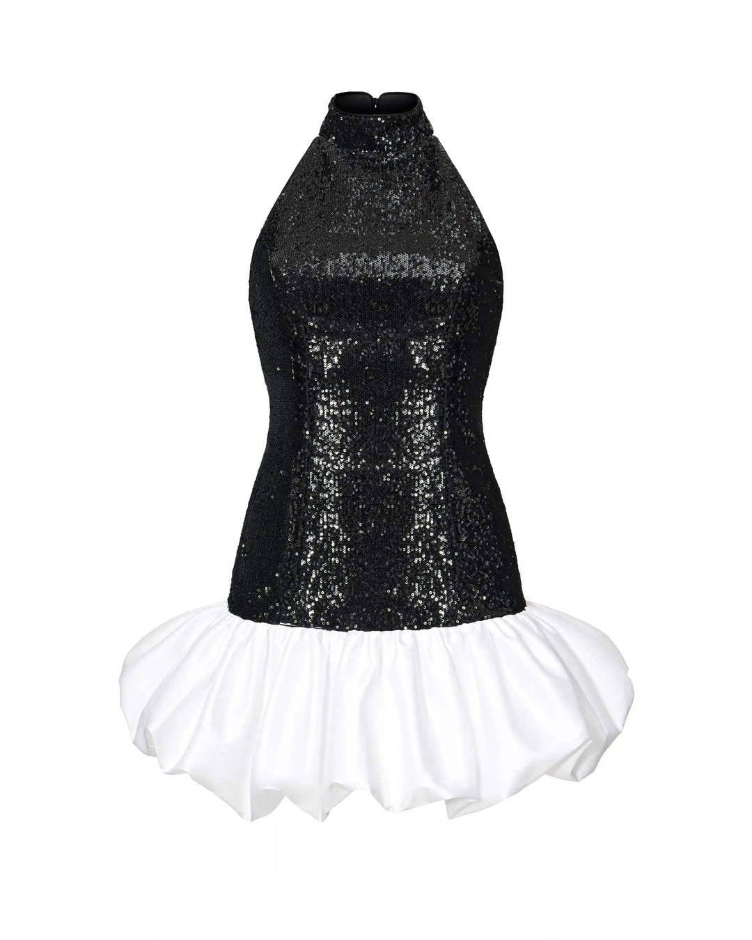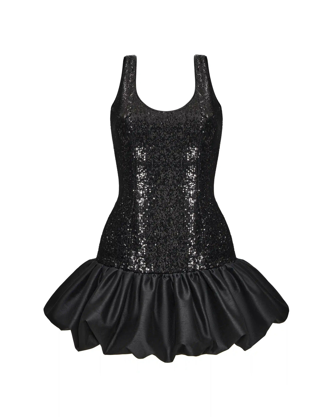 Lilian mini, mini dress with a black sequin bodice and a balloon skirt in black taffeta