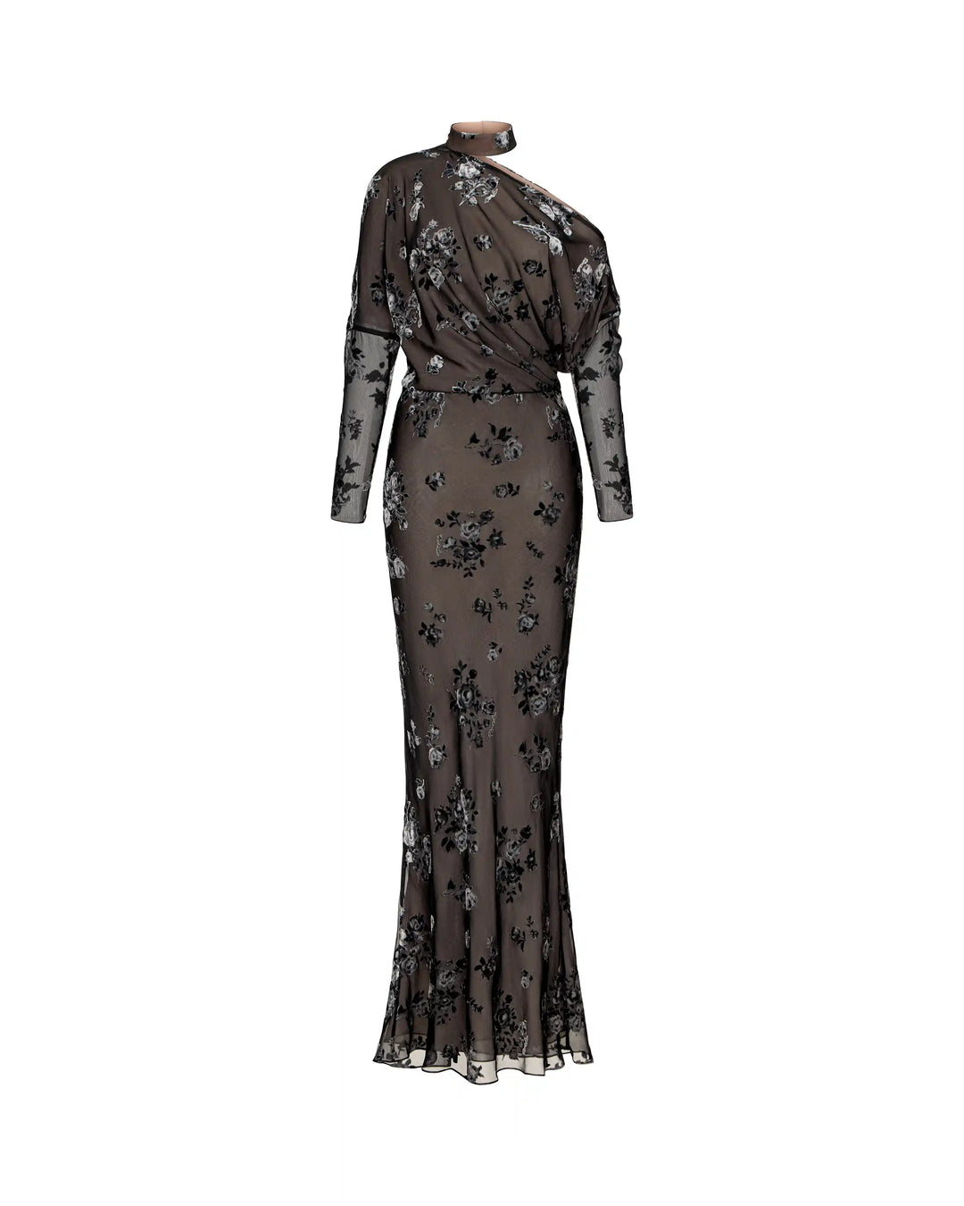 Anika maxi, maxi dress with long sleeves and a choker made of black satin with floral print
