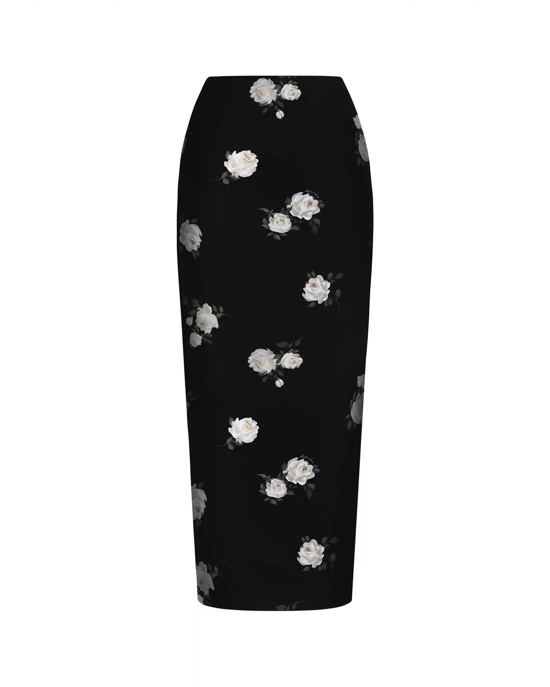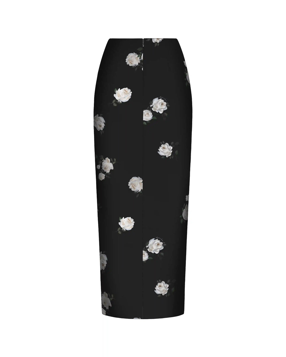 Adrianne, midi skirt made of black crepe de chine with floral print