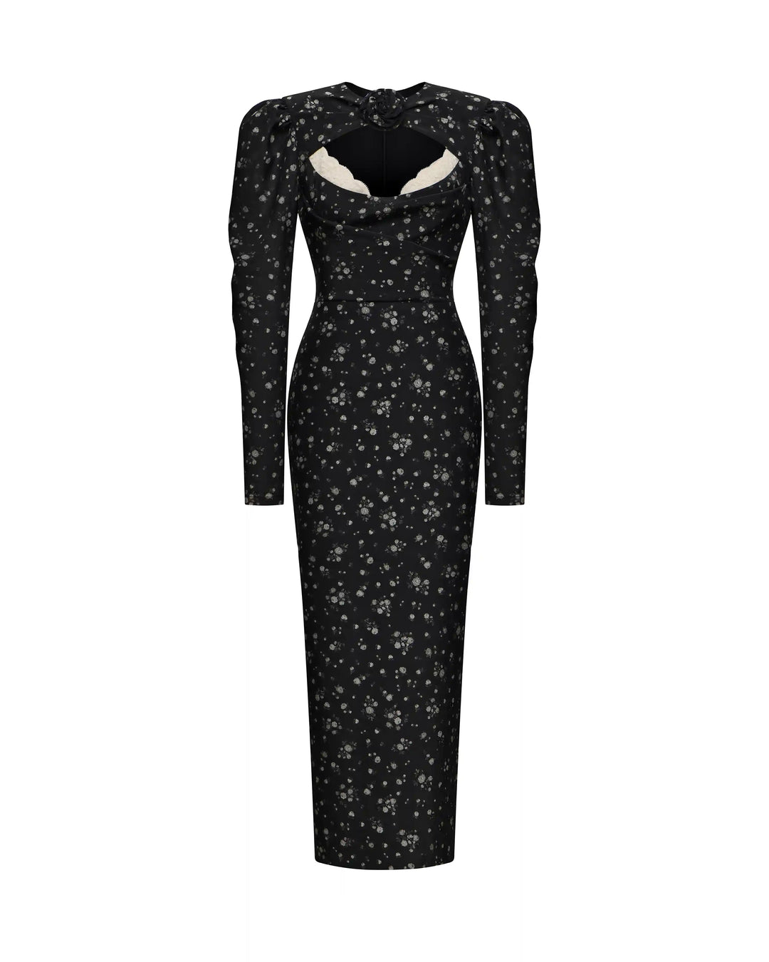 Macel midi, midi dress made of black crepe de chine with floral print and a rose