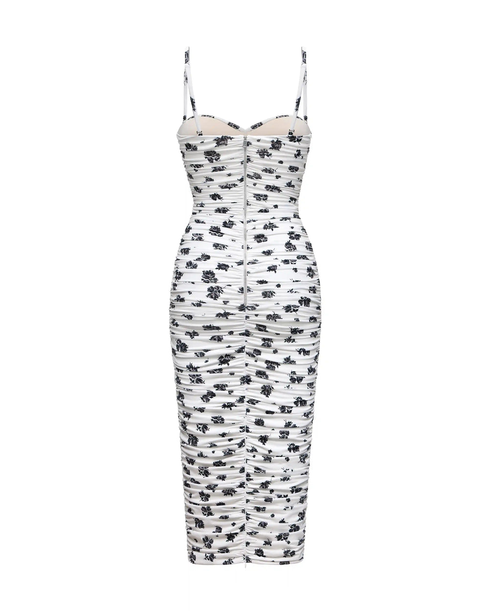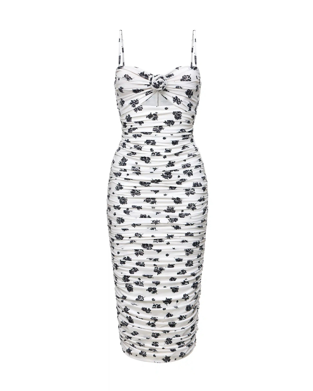 Nicole midi, midi dress made of ivory biflex with floral print and a rose