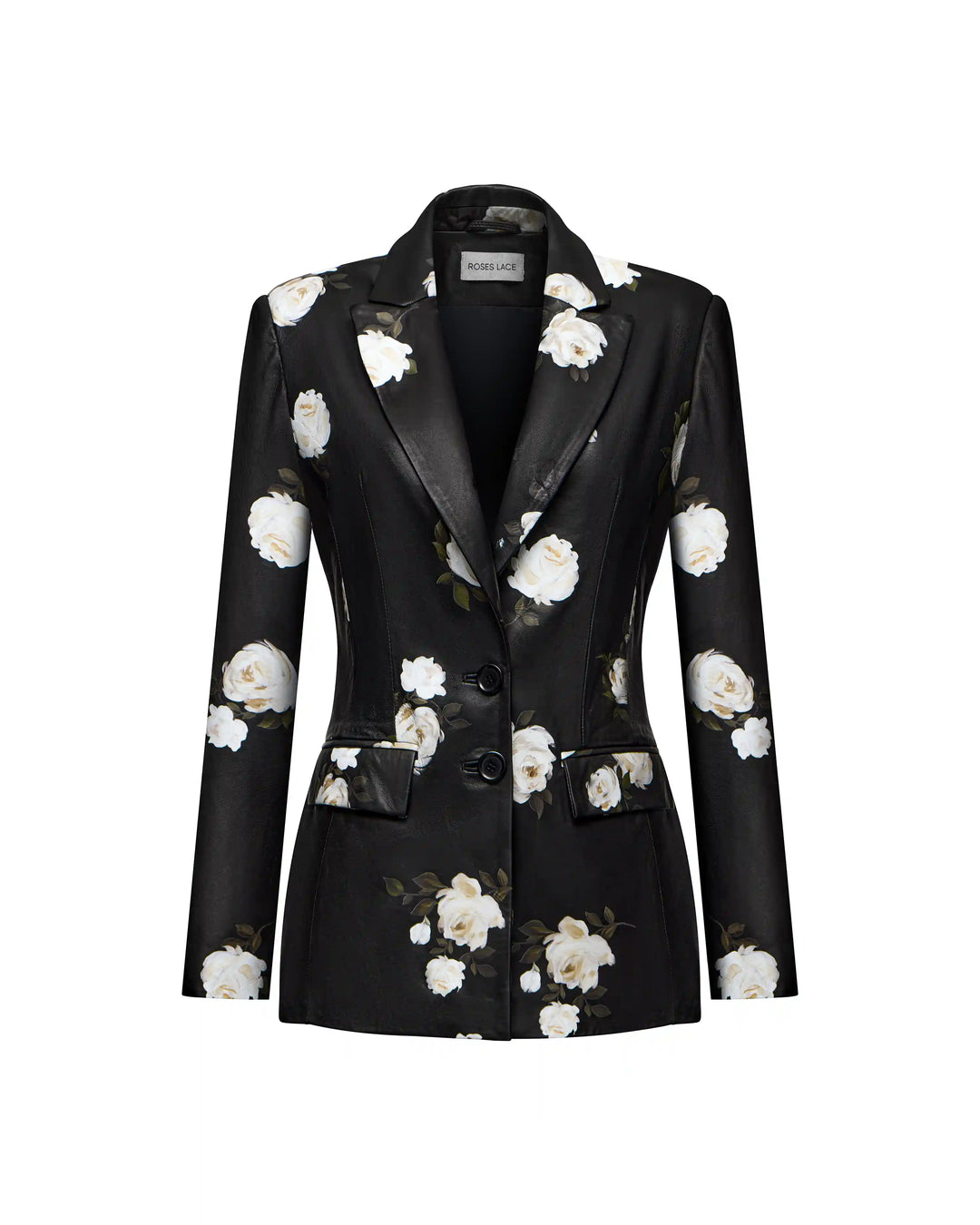 Mona no frill, mini skirt made of black genuine leather with a floral print