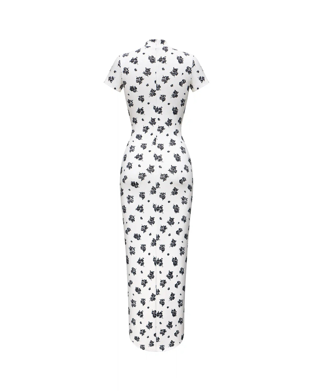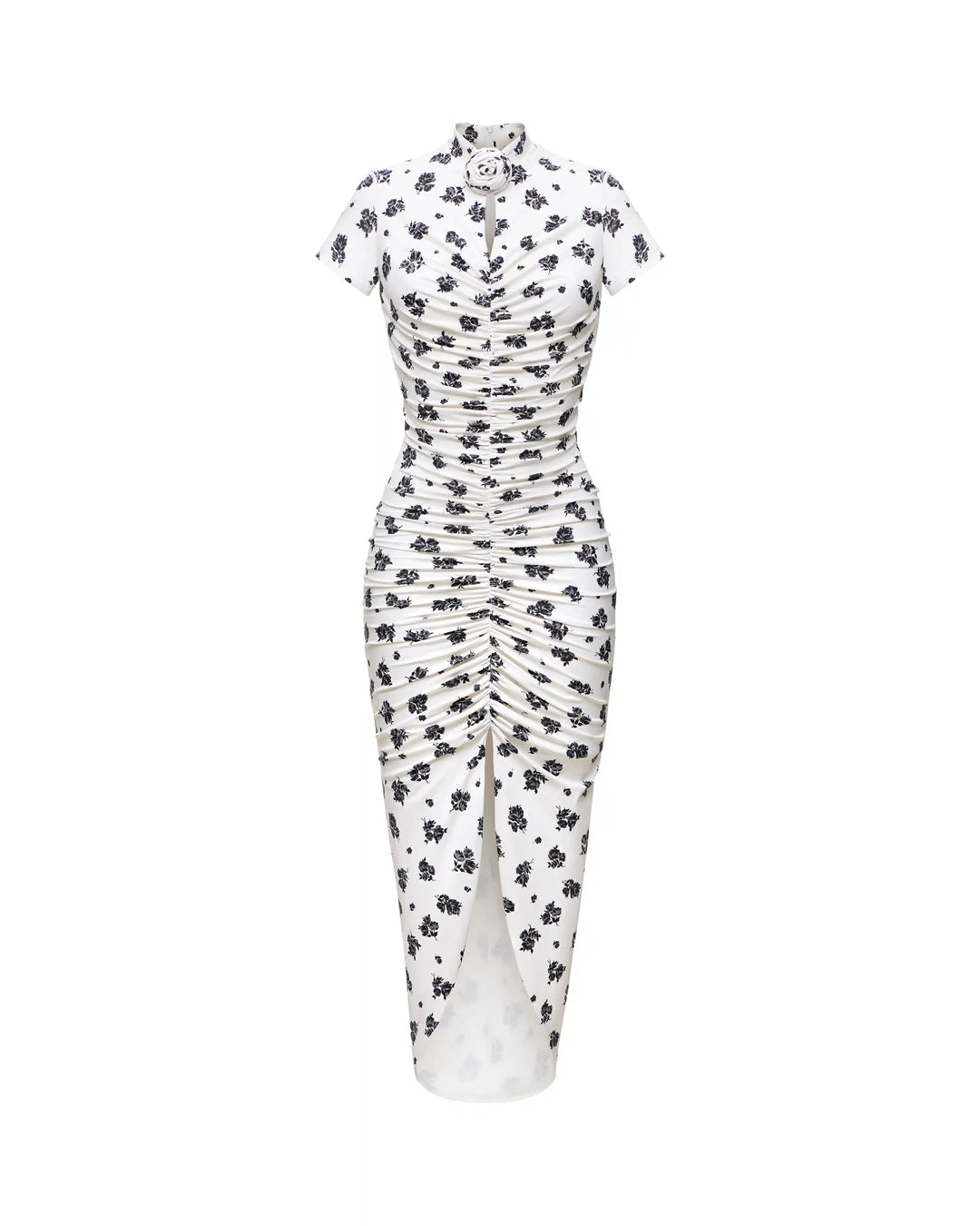 Amanda midi, midi dress with short sleeves made of ivory biflex with floral print and a rose