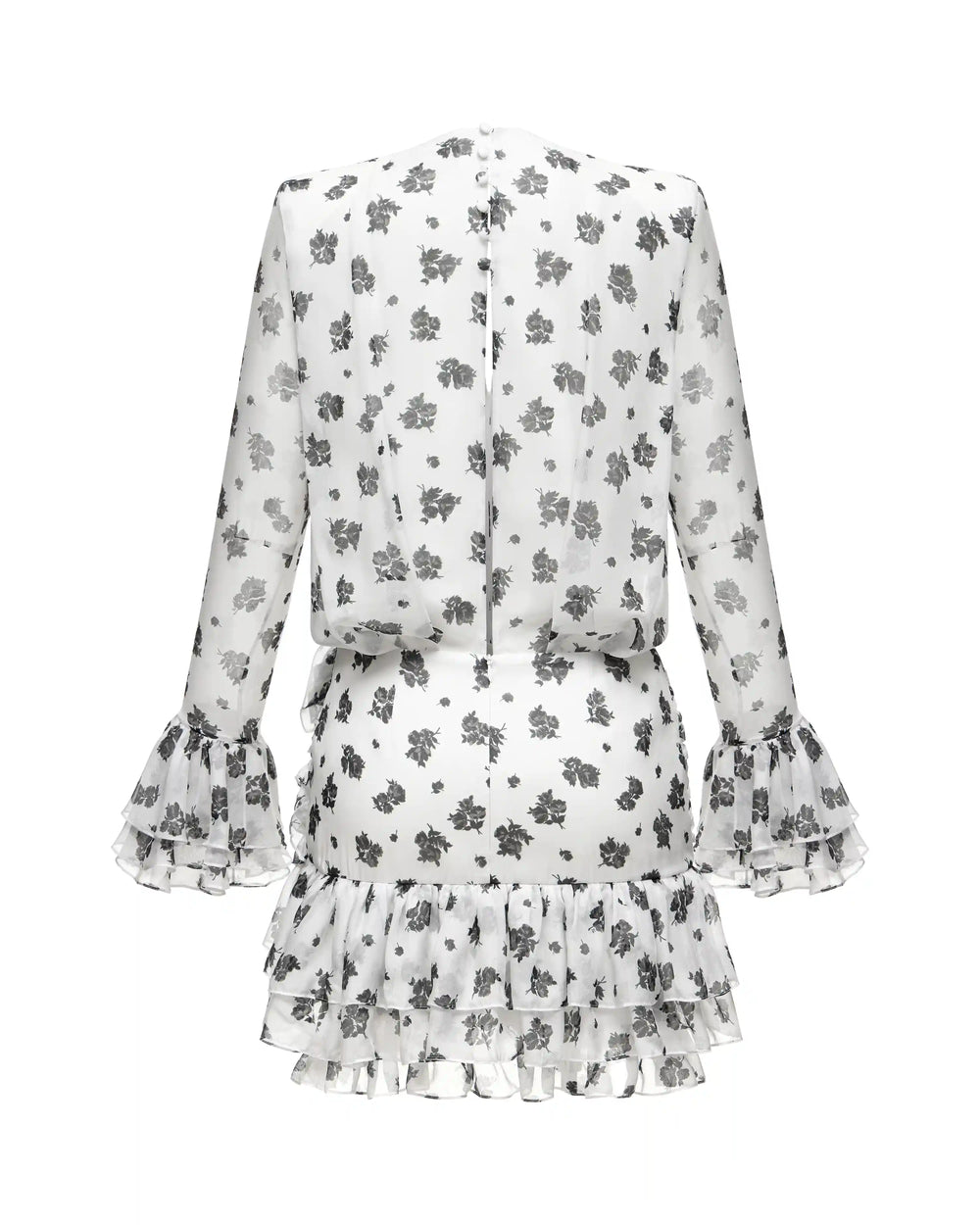 Mira, mini dress made of ivory chiffon with floral print and a rose