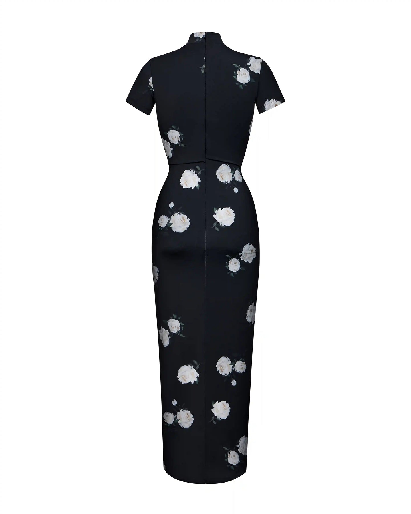 midi dress with short sleeves made of black biflex with floral print and a rose