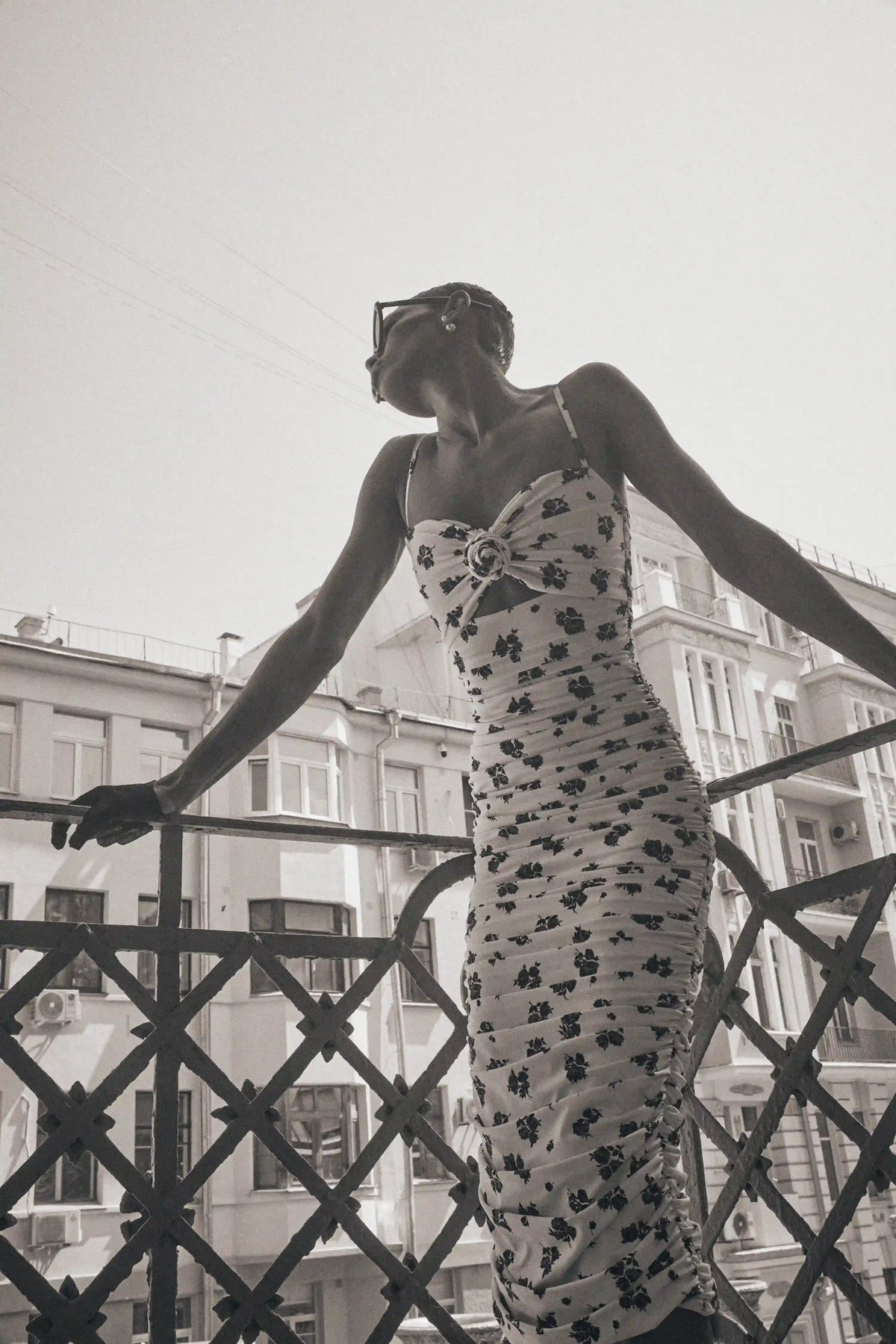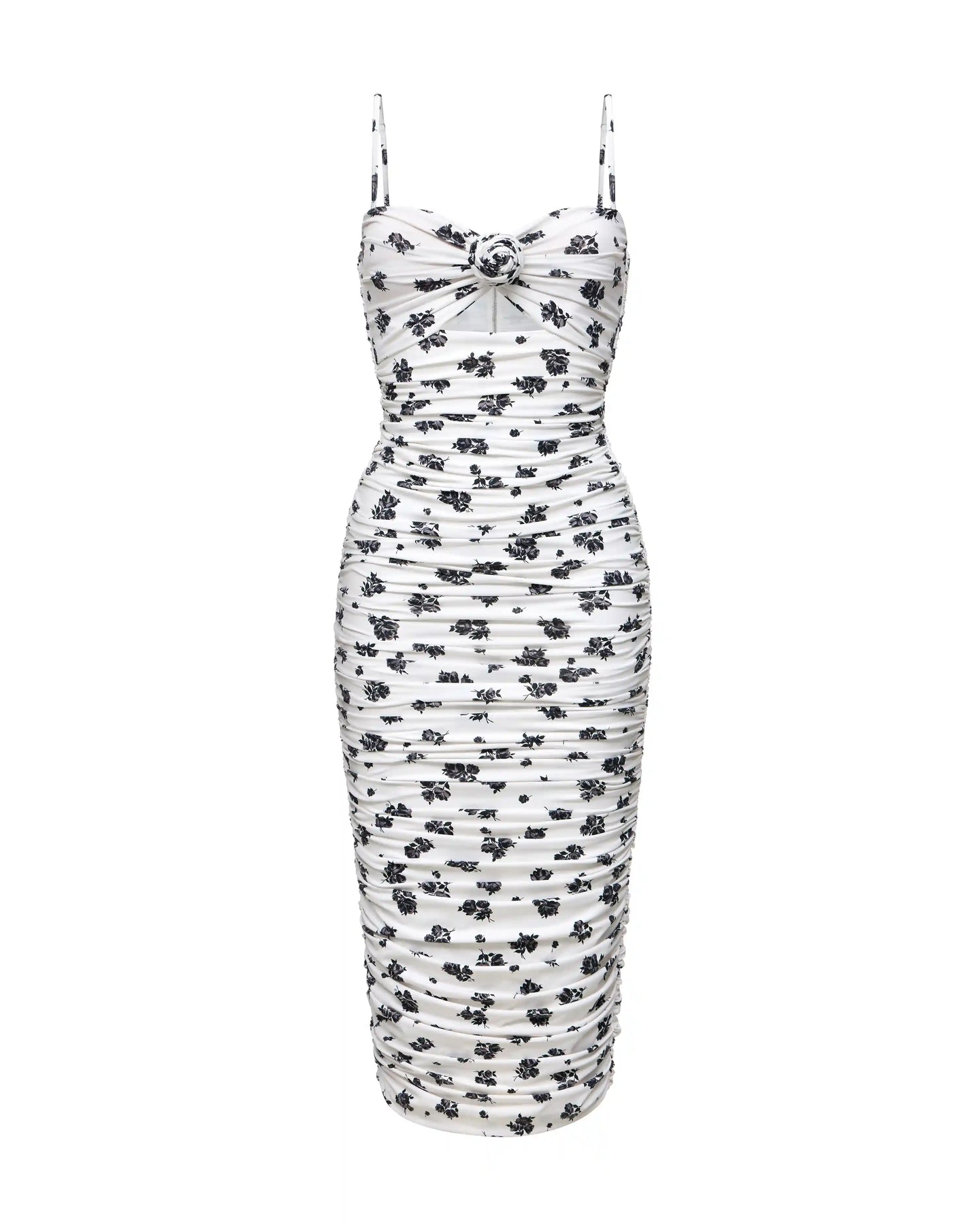 Nicole midi, midi dress made of ivory biflex with floral print and a rose