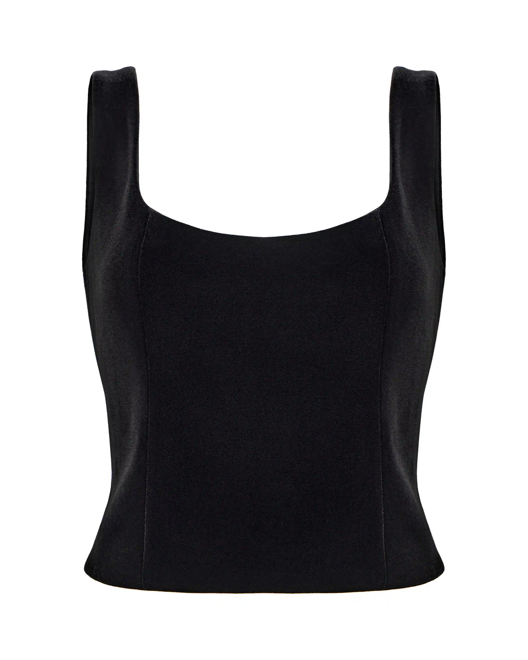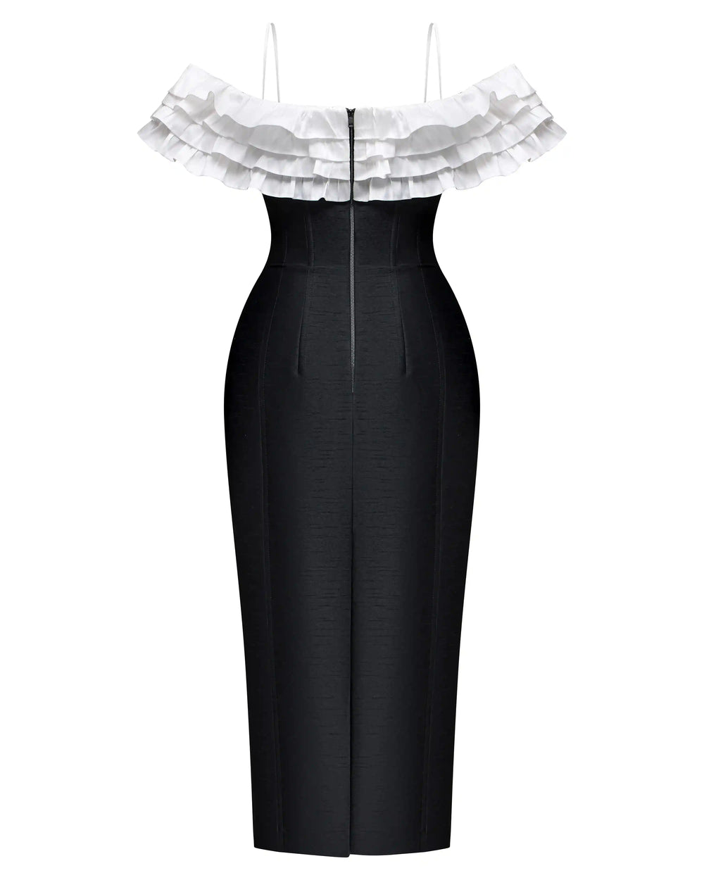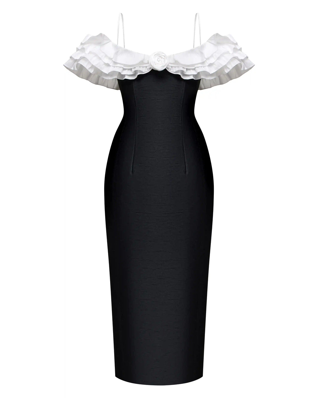 Celine, midi dress with a top made of black velvet and a skirt of ivory satin