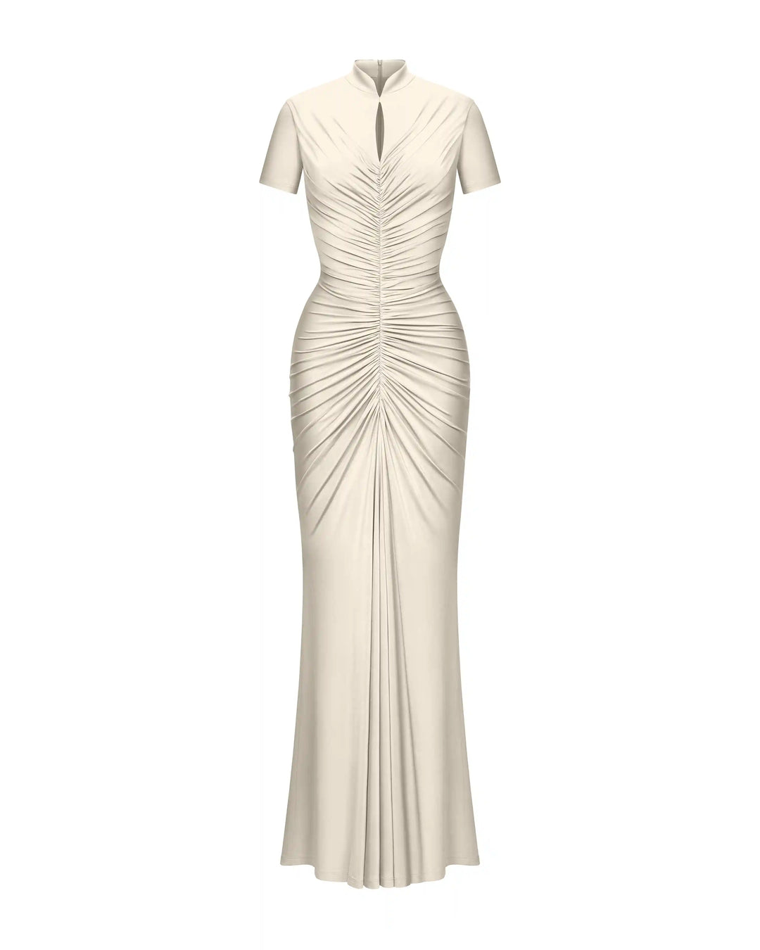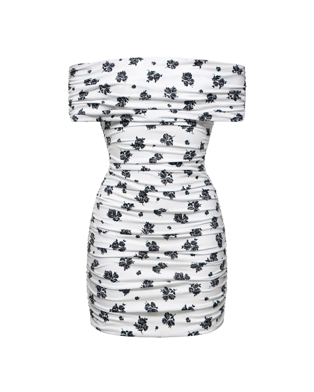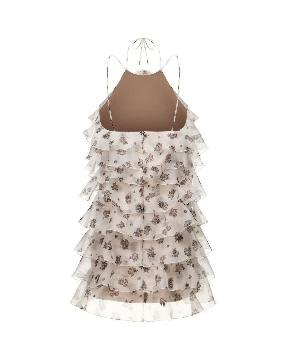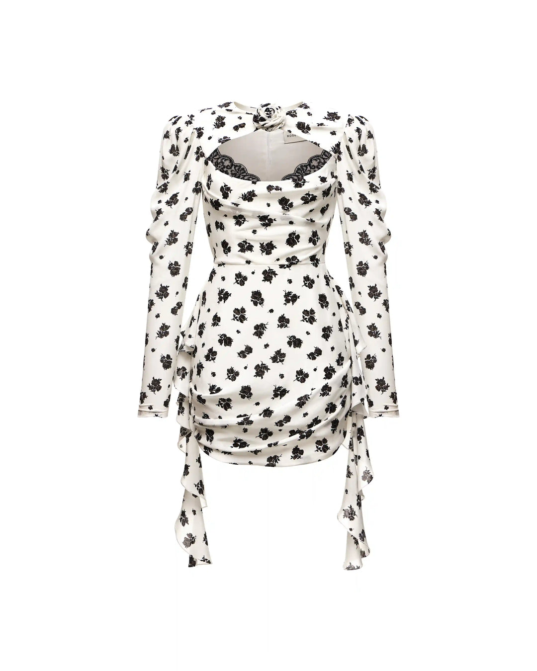 Dahlia, mini dress made of ivory organza with floral print and rose