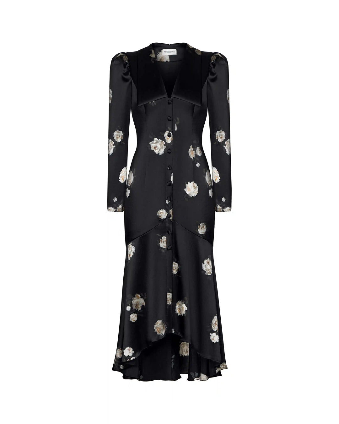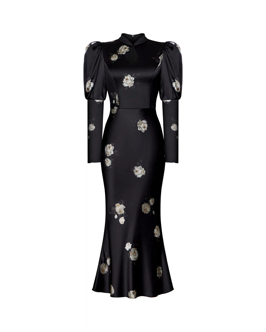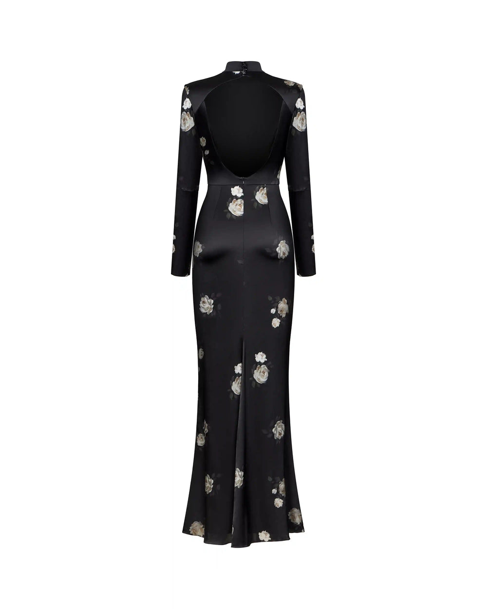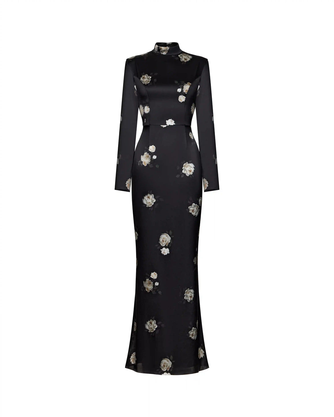 Muna, maxi dress with long sleeves made of black satin with a floral print
