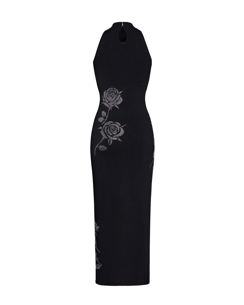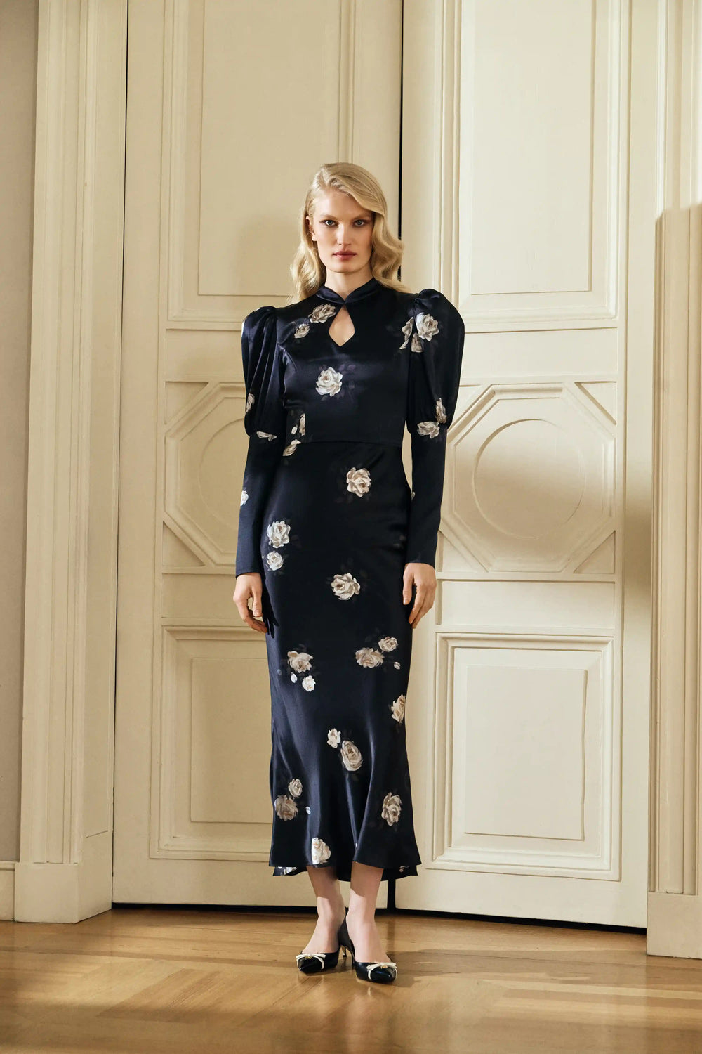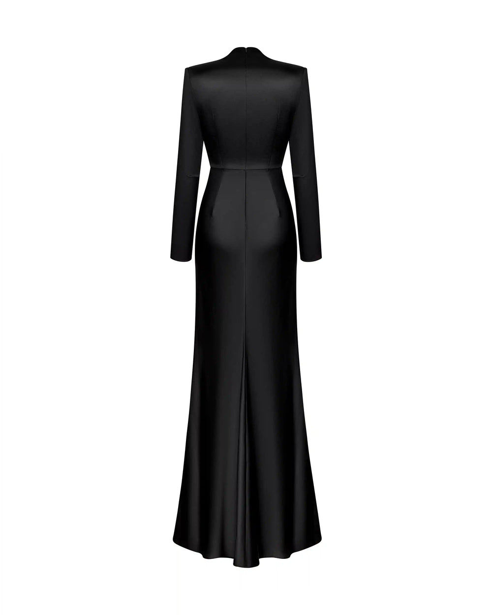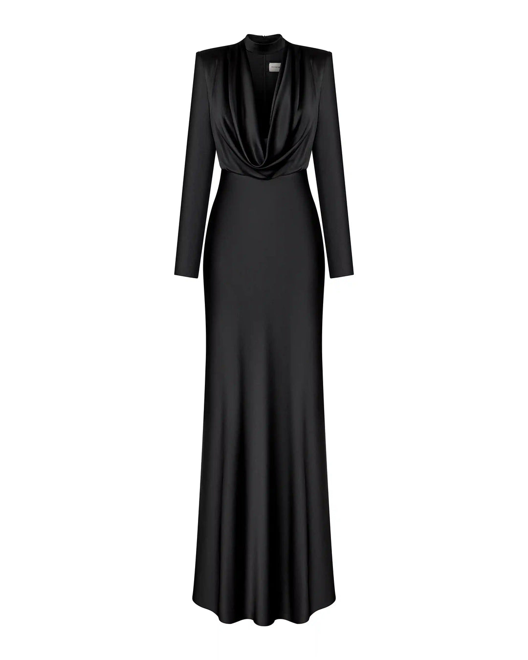 Muna, maxi dress with long sleeves made of black satin with a floral print