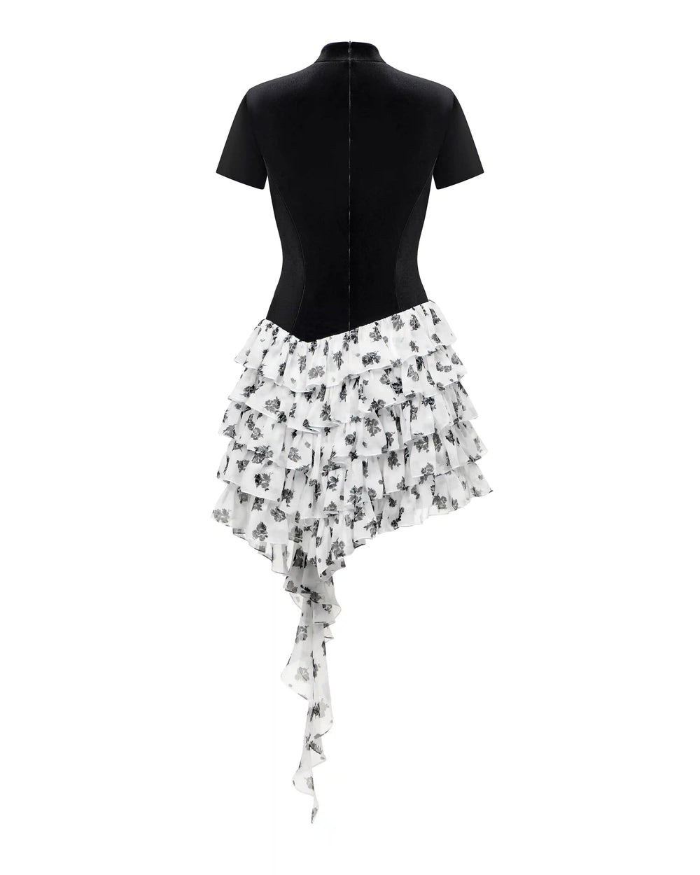 Sona, mini dress made of black velvet with a skirt of ivory chiffon with a floral print