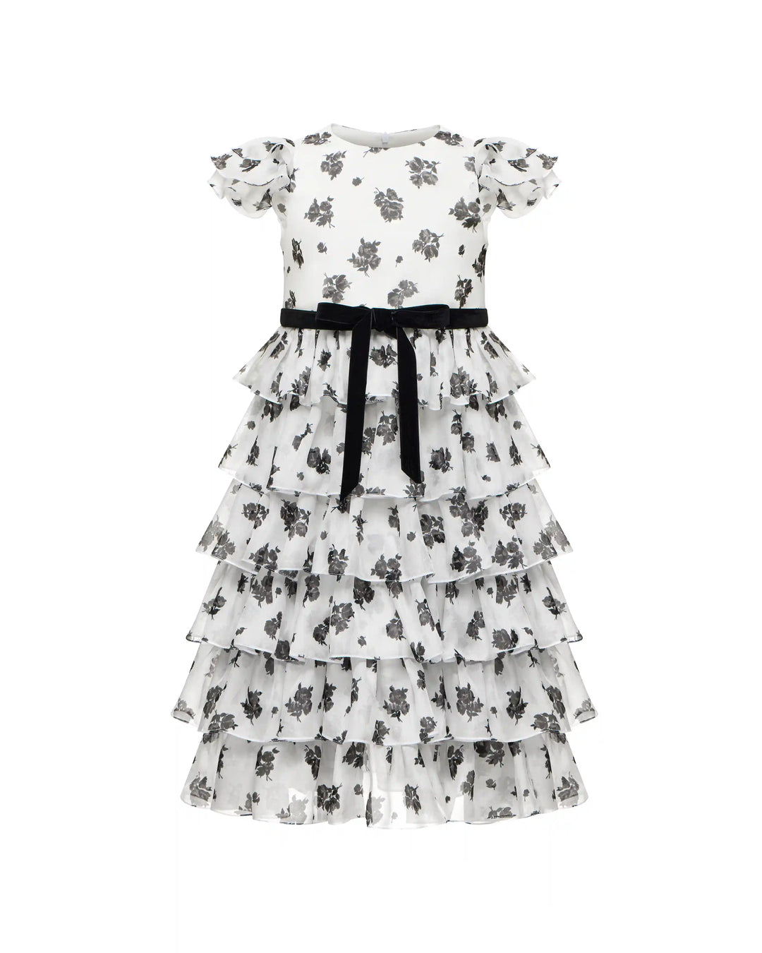 Ava, children's dress made of ivory chiffon with floral print, with a bow