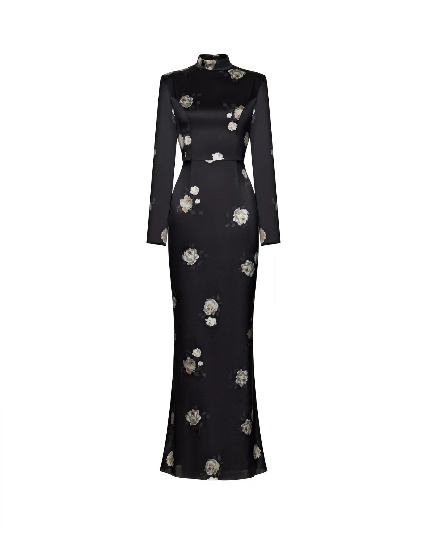 Maxi dress with long sleeves made of black satin with a floral print