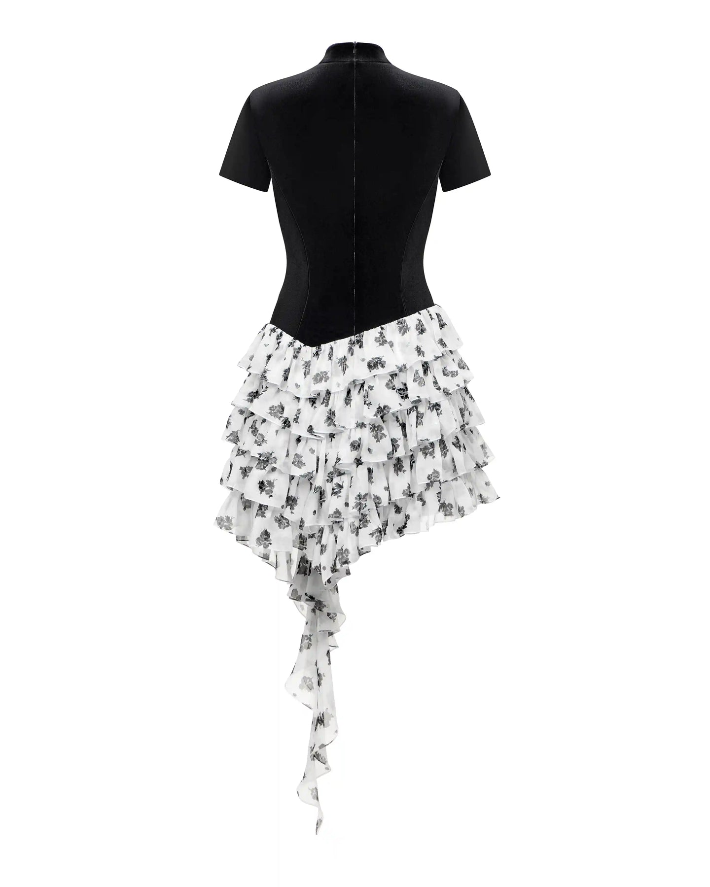 Mini dress made of black velvet with a skirt with ruffles of ivory chiffon with a floral print