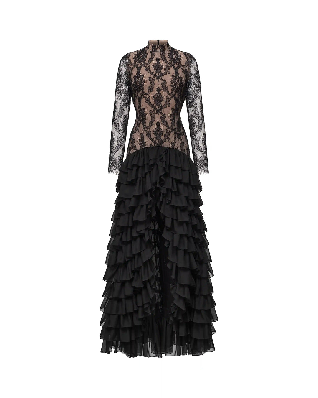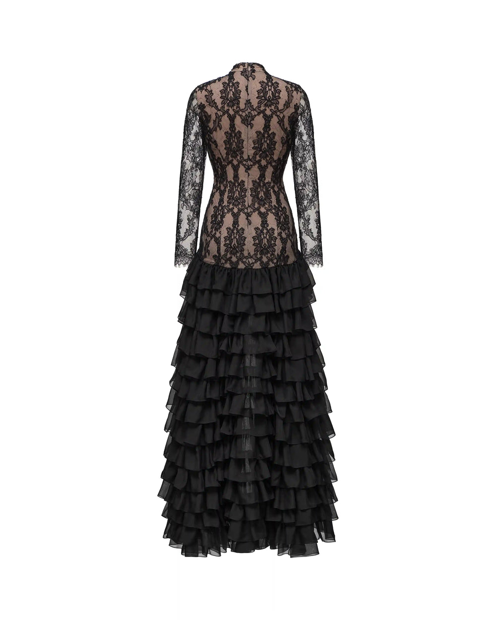 Stella maxi, maxi dress made of black lace with a skirt of black chiffon