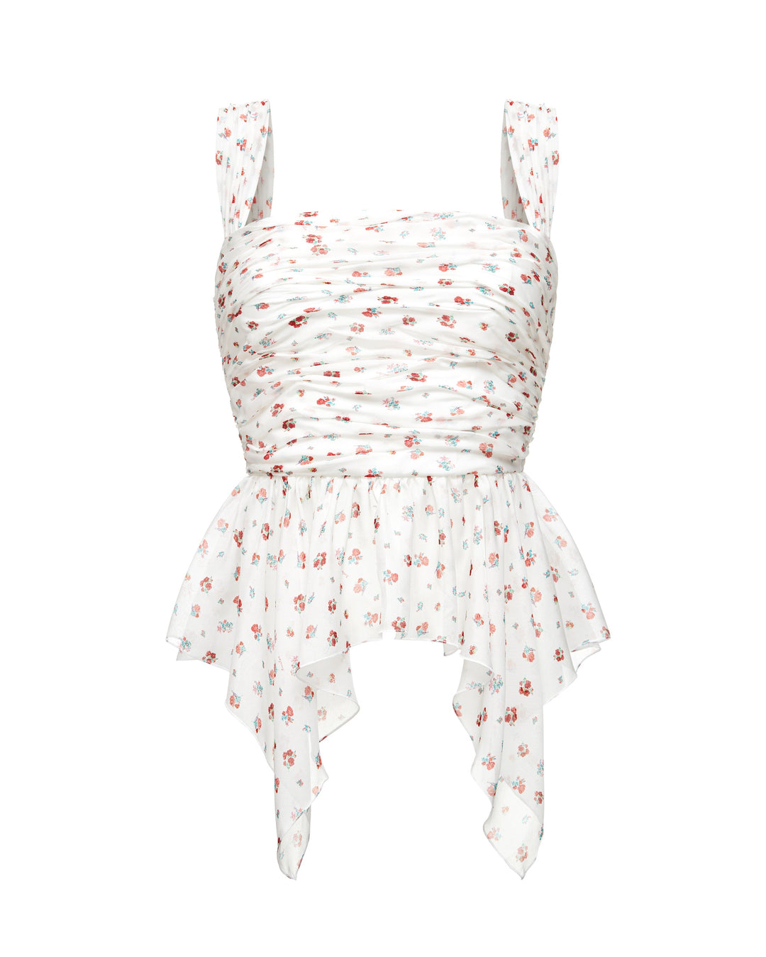 Jean, corset top with asymmetrical peplum, milky white with delicate red blossoms