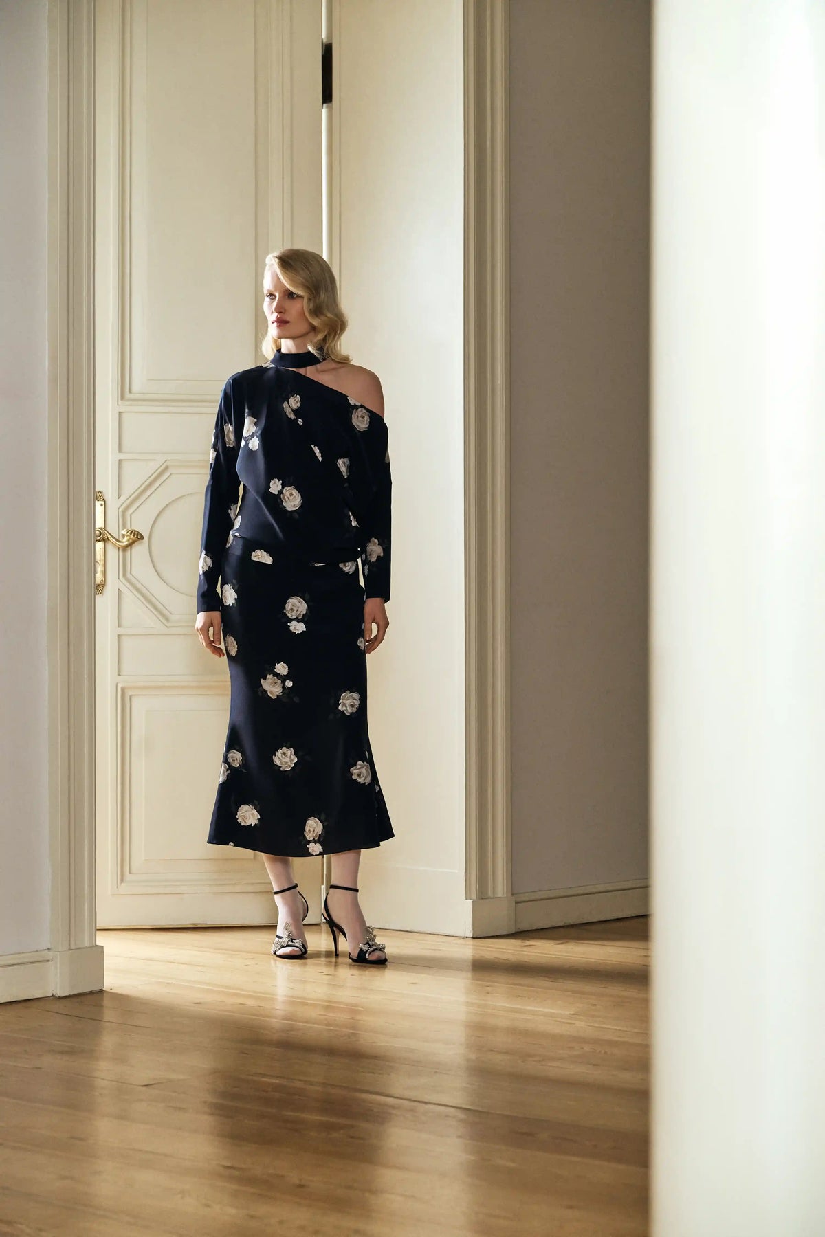 top with long sleeves and a choker made of ivory crepe de chine with floral print