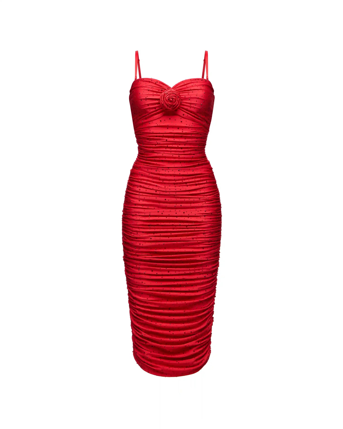 Red biflex midi dress with rhinestones and a rose