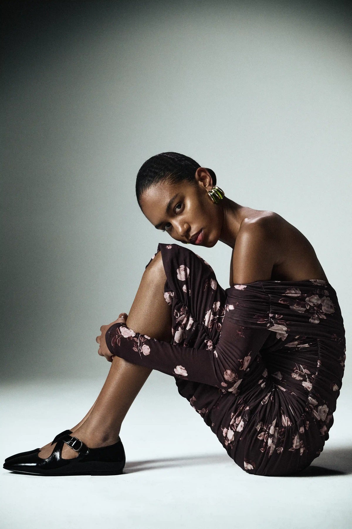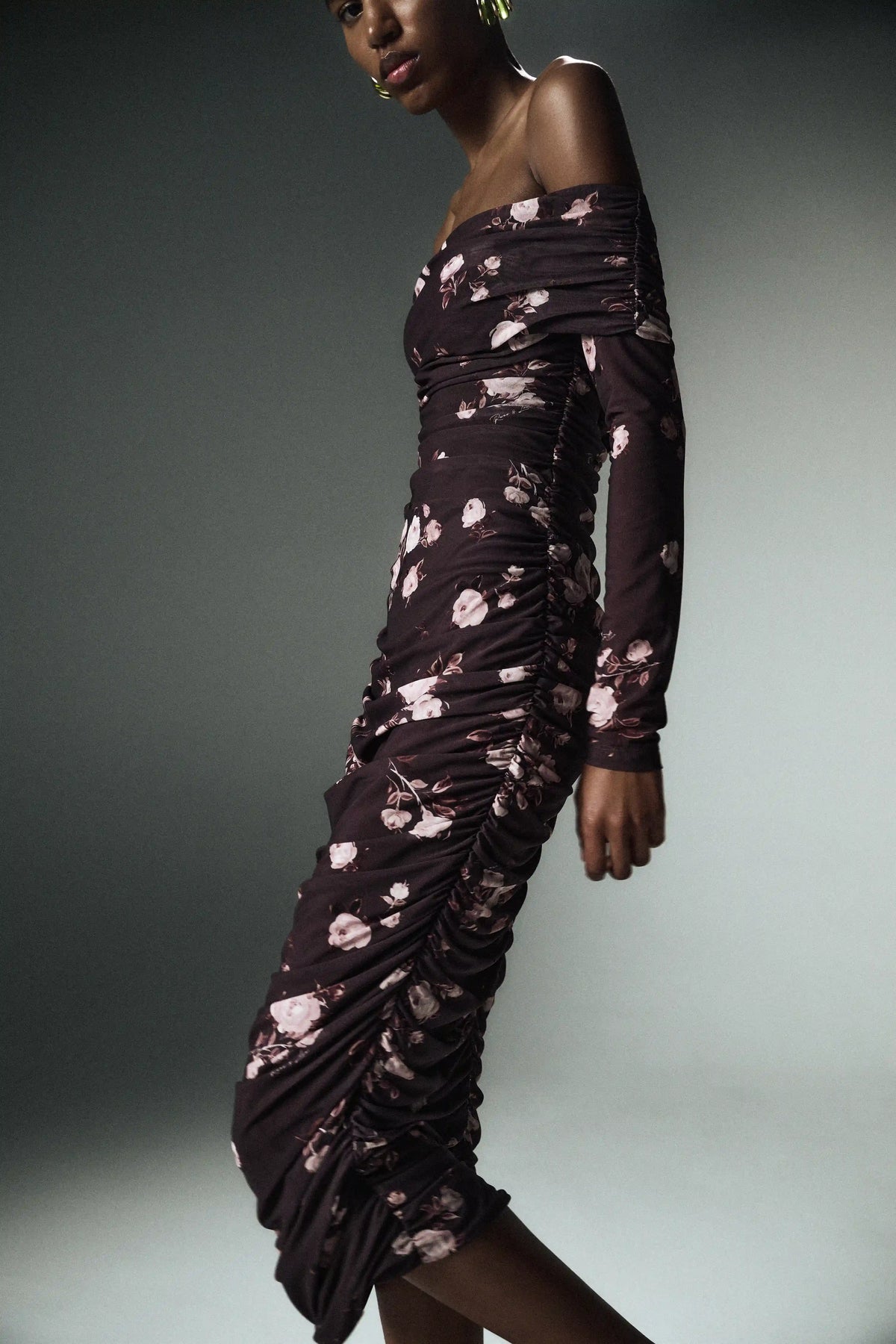 draped midi dress with long sleeves made of chocolate mesh with floral print